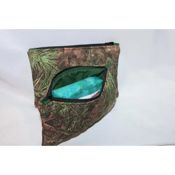 This Camo Zipper pouch is fully lined, quilted, and ready for anything you want to put in it! This bag comes in two options of zippers, brown or black!