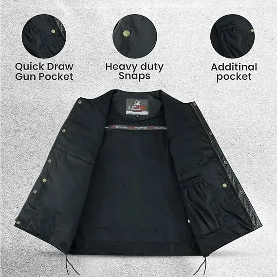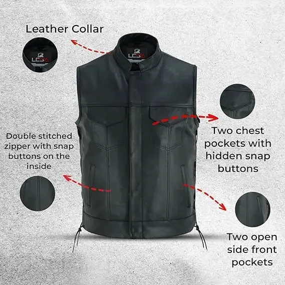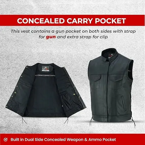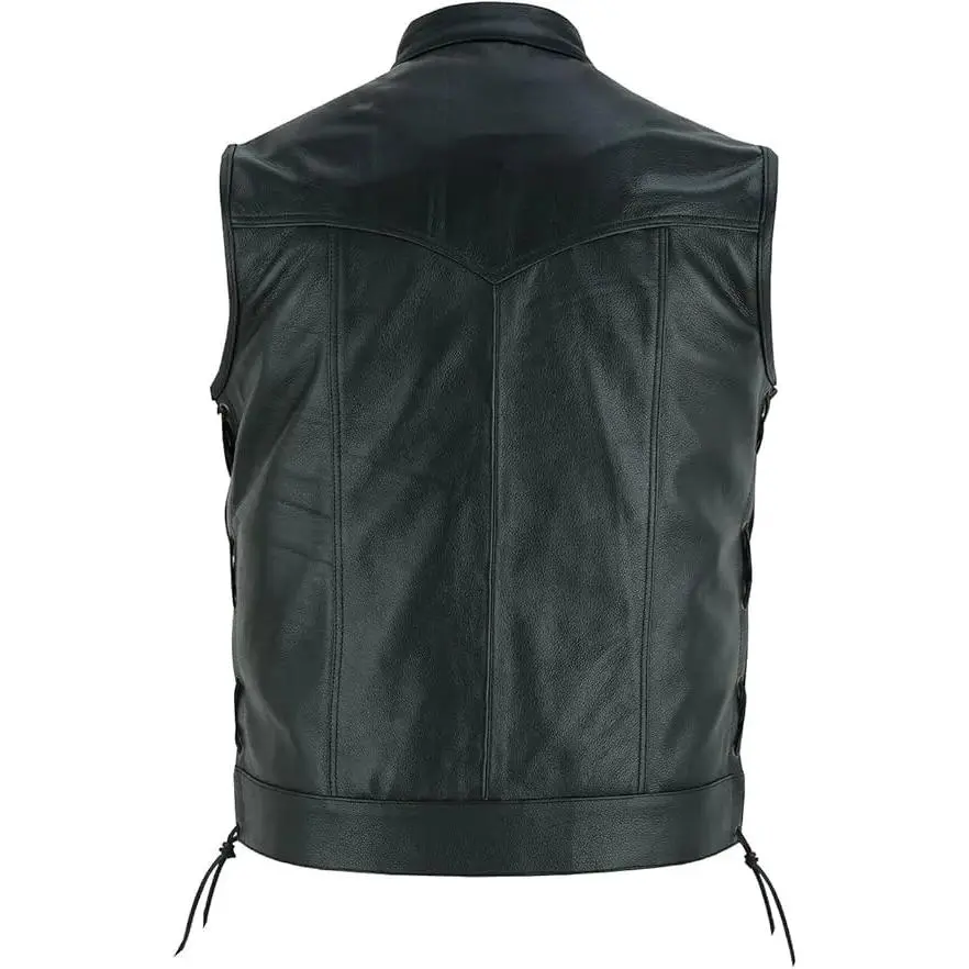 Men’s Black Leather Motorcycle Vest with Collar – Cowhide Biker Vest with Side Laces, Concealed Carry Pockets & Adjustable Fit