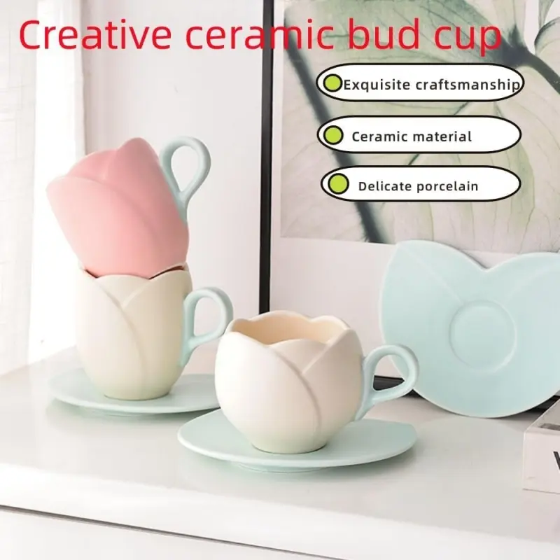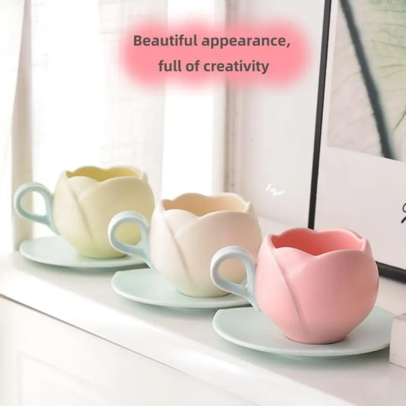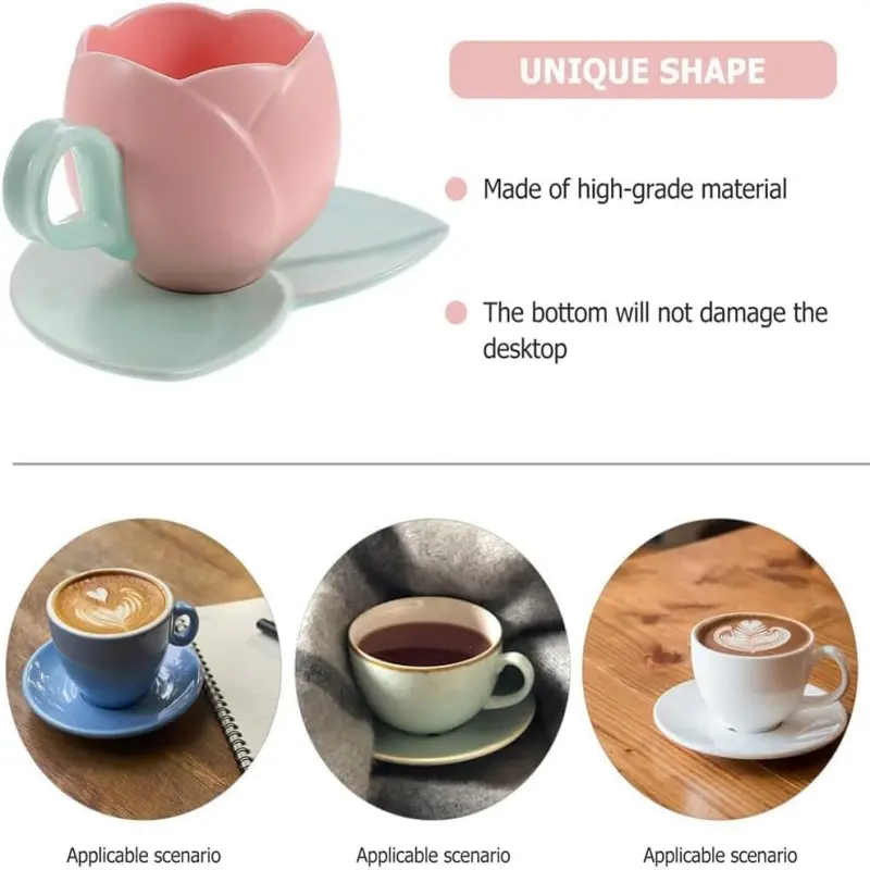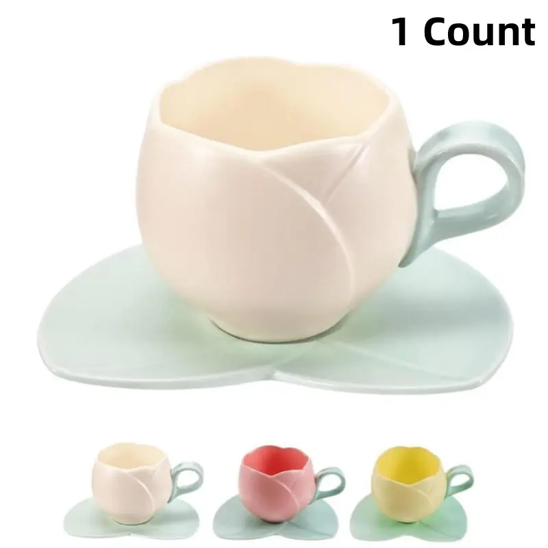 1 Count Ceramic Tulip Coffee Mug with Saucer Set, Shape Cup, Cute Mug Set, Latte Mugs for Tea Coffee Milk for Home Office Aesthetic 🌸Multi-use Cup and Saucer  Designer Coffee Mug ☕  🥐 🍰