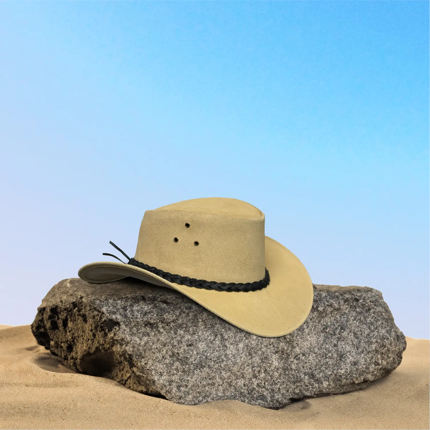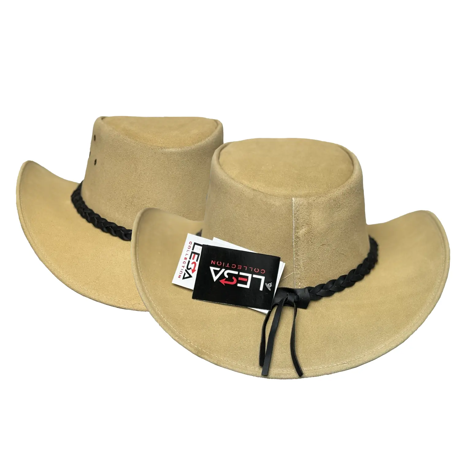 The Australian Western Style Tan Suede Cowboy Hat from Lesa Collection combines rugged charm with timeless style. Crafted from genuine tan suede leather, this hat offers a soft, refined finish that improves with age. Its wide, shapeable brim provides excellent sun protection, while the breathable eyelets ensure comfort during outdoor activities. The braided leather band adds an authentic touch, making it perfect for both men and women seeking a classic western look.