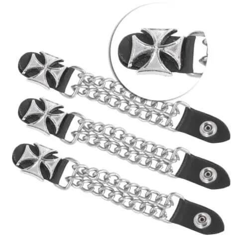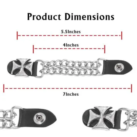 This Motorcycle Vest Extender gives your biker vest a bold and classic upgrade. Made with durable chrome double chains and strong cowhide leather tabs, it is designed for both comfort and style. The silver Iron Cross emblem adds a tough biker look, making your vest stand out on every ride.