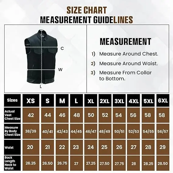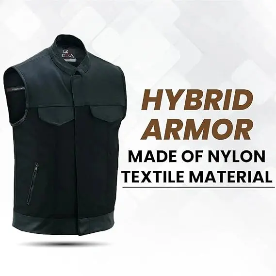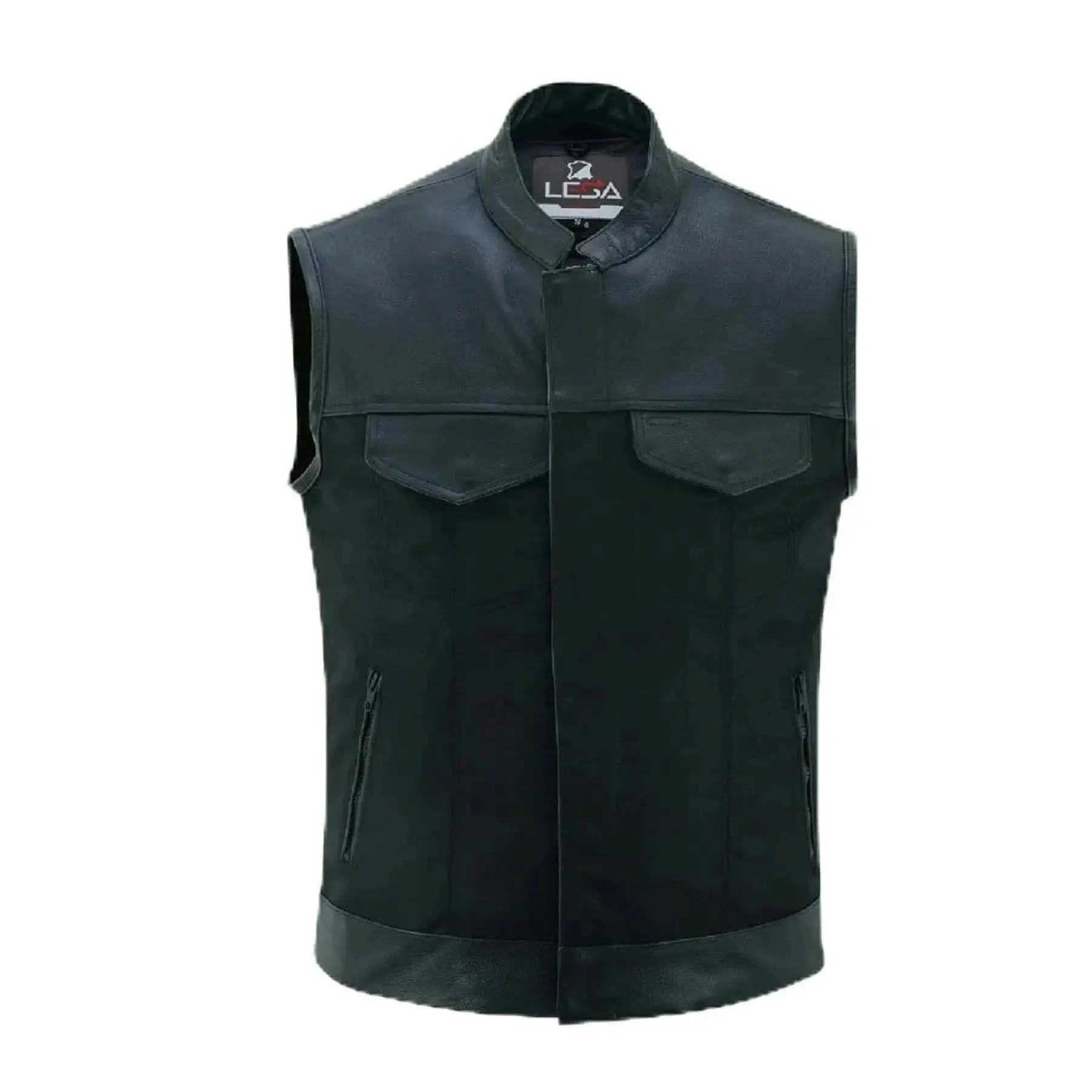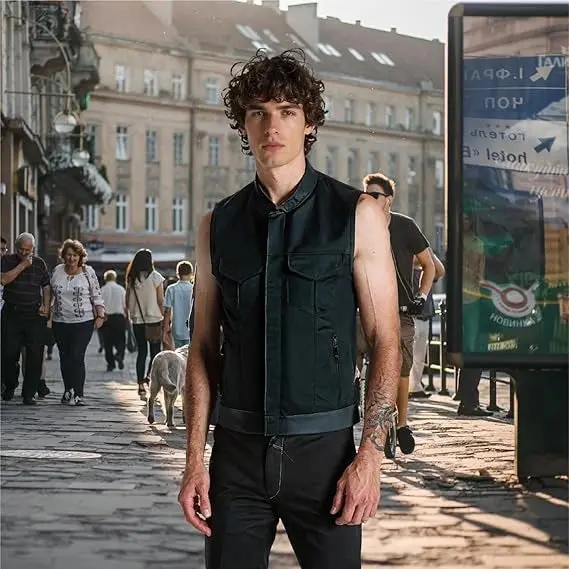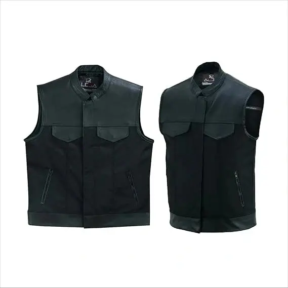 The Men’s Black Denim Motorcycle Vest with Collar from Lesa Collection is designed for riders who value a strong and timeless biker look. Made with a durable nylon textile body and premium leather panels, this vest combines toughness with classic style. The round collar and dual front closure with zipper and snap studs give it a clean, structured design that stands out on the road.