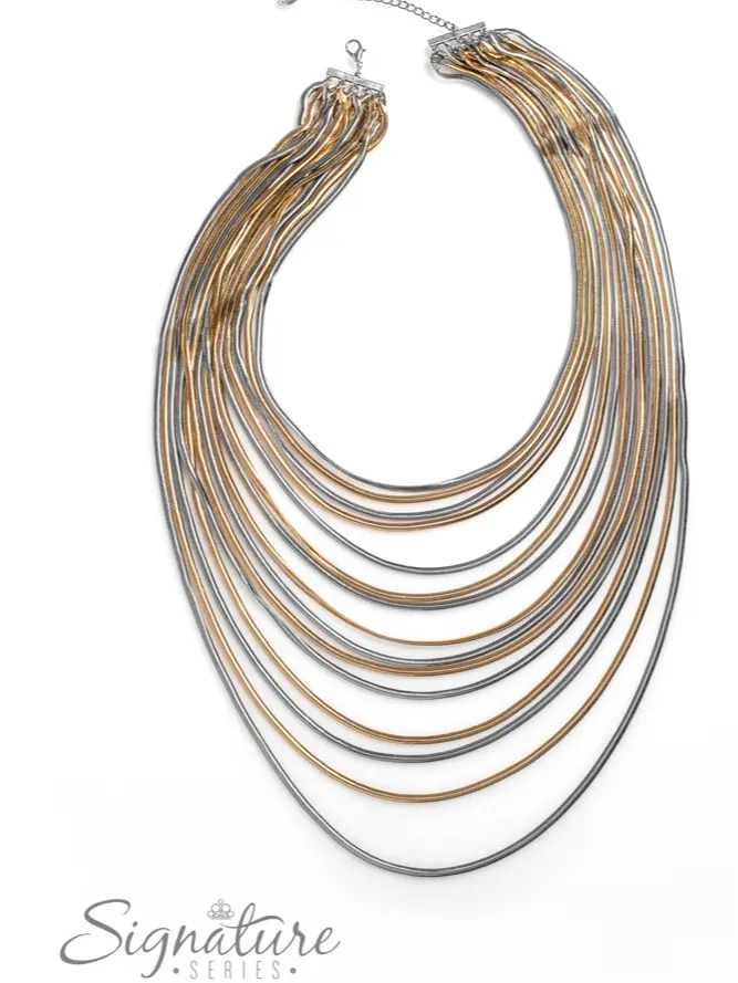 Strand after strand of sleek, flat, snake chain cascade down the chest in dreamy defiance. Alternating in flawless finishes of silver and gold, each metallic tier extends a little farther than the last, building into a mixed metal mashup of unapologetic layers. Features an adjustable clasp closure. Sold as one individual necklace. Includes one pair of matching earrings.