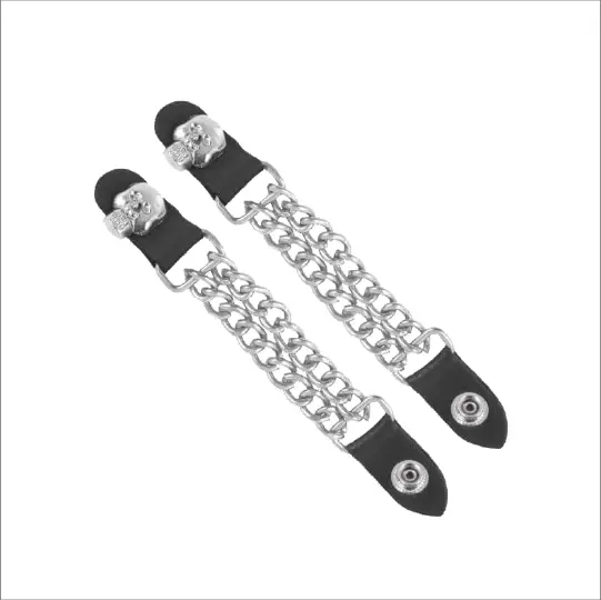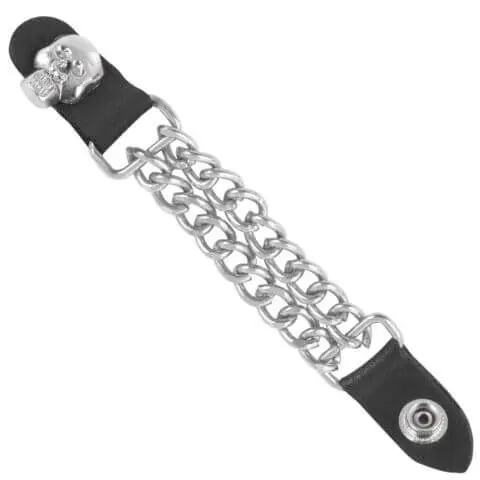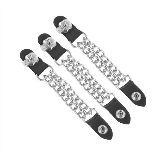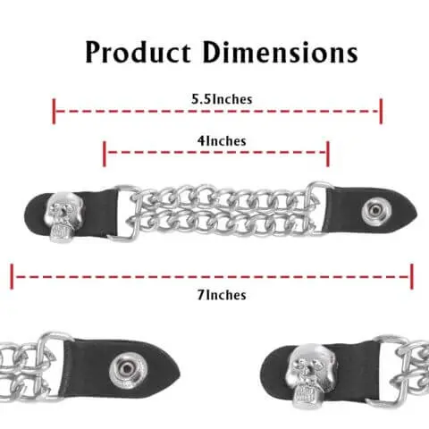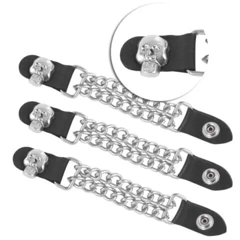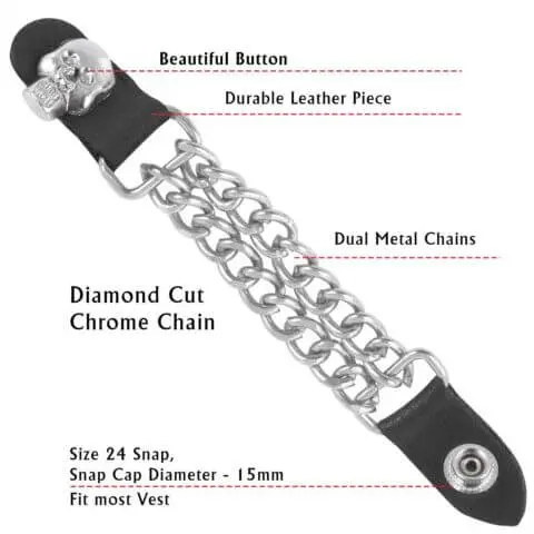 Add a rugged touch to your biker gear with this Motorcycle Vest Cuban Chain Extender. Made from genuine cowhide leather and a durable chrome Cuban chain, it is built to last and designed for a perfect fit. The standout feature is the handmade skull head design, giving your vest a bold and unique look. With snap buttons, it attaches easily and securely, while also letting more airflow through your vest during rides.