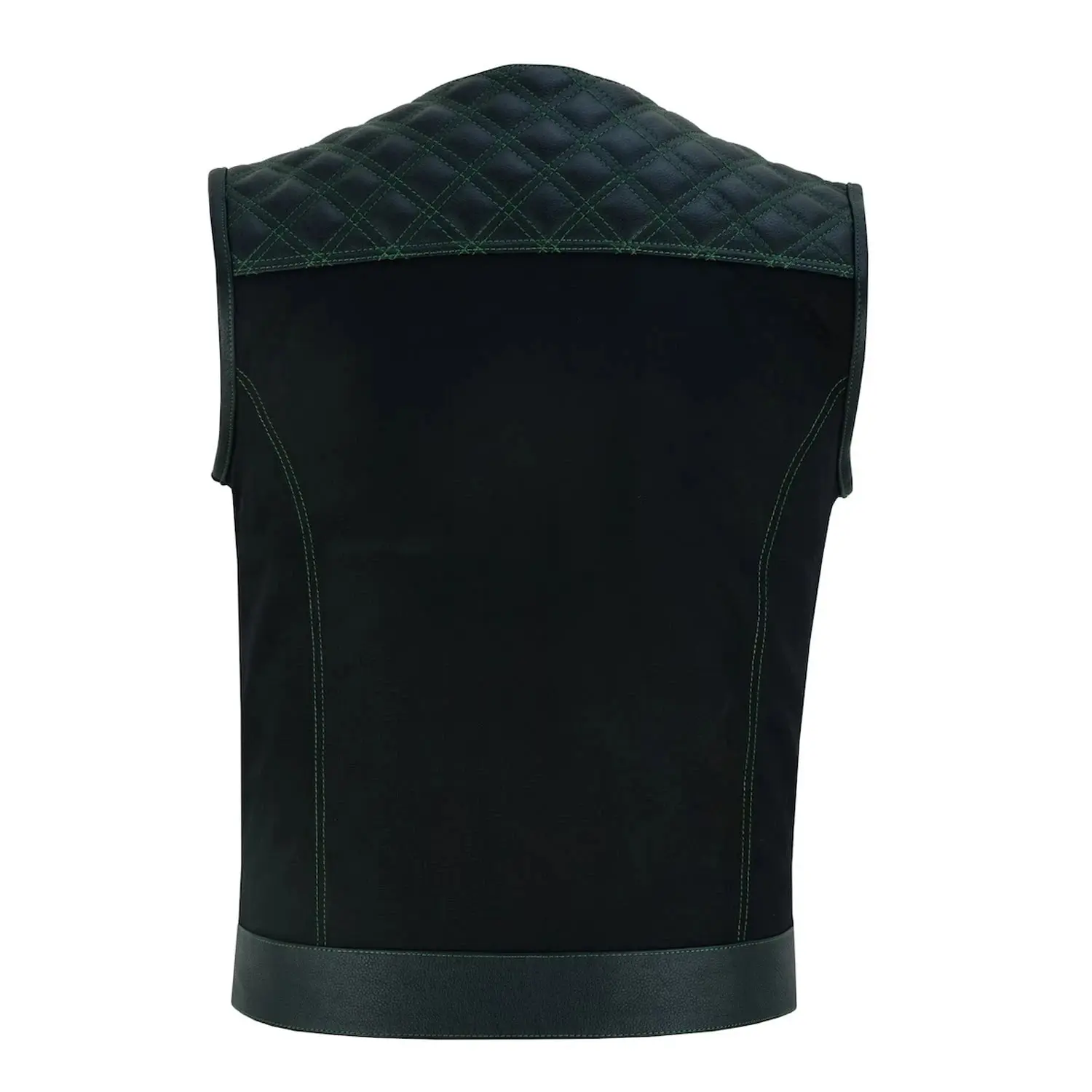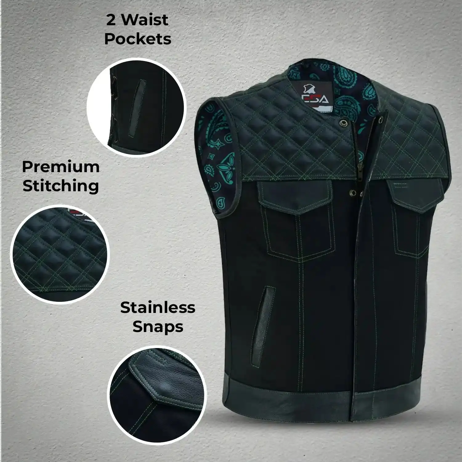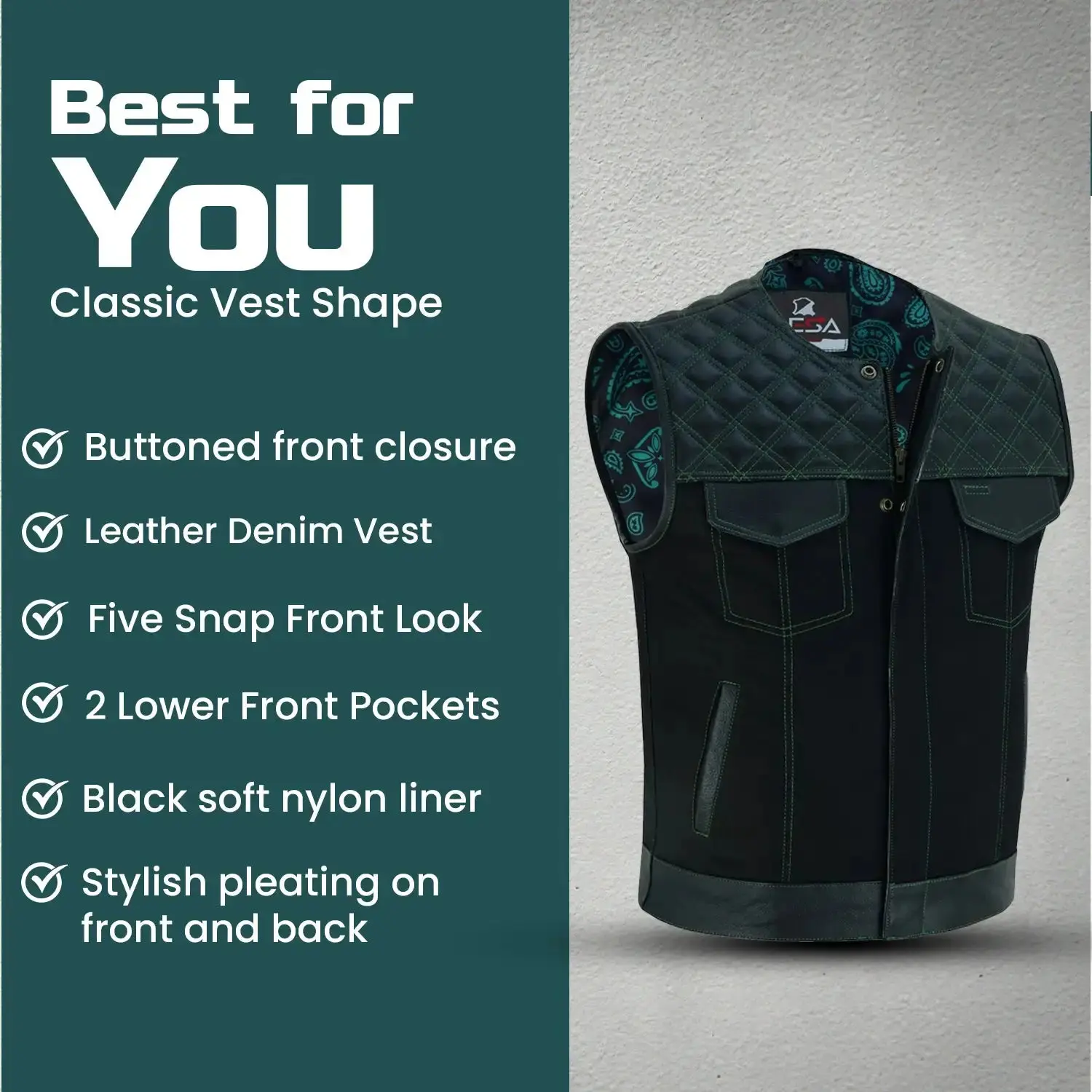 Men’s Denim & Leather Motorcycle Vest – Collarless Green Stitch Biker Vest with Quilted Padding, Multi Pockets & Zipper Snap Closure