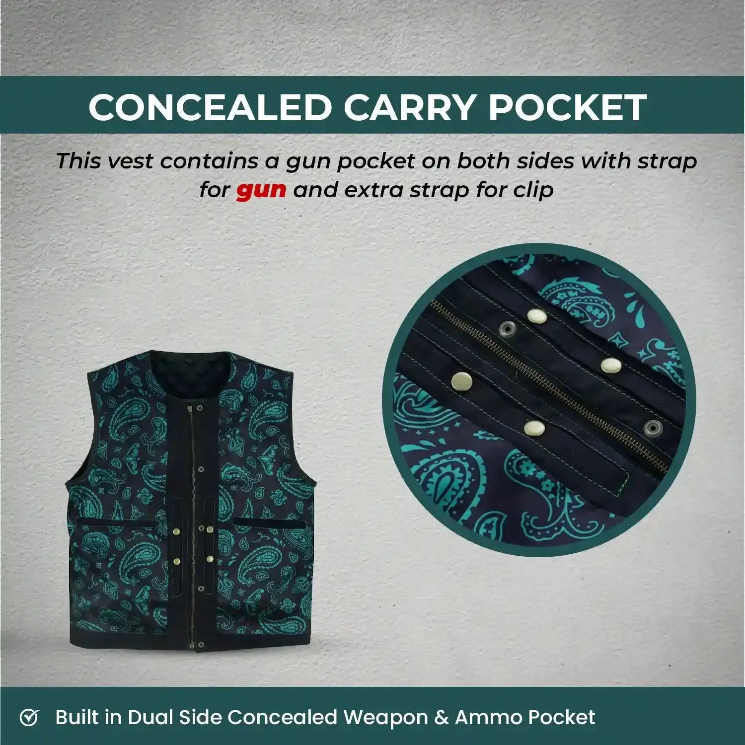The Men’s Black Denim Motorcycle Vest from Lesa Collection is designed for riders who value both style and functionality. Crafted from durable black denim, this vest features a hidden gun pocket for secure storage and distinctive green stitching that adds a bold touch. Its collarless design ensures comfort, while the side laces allow for an adjustable fit, making it suitable for various body types.