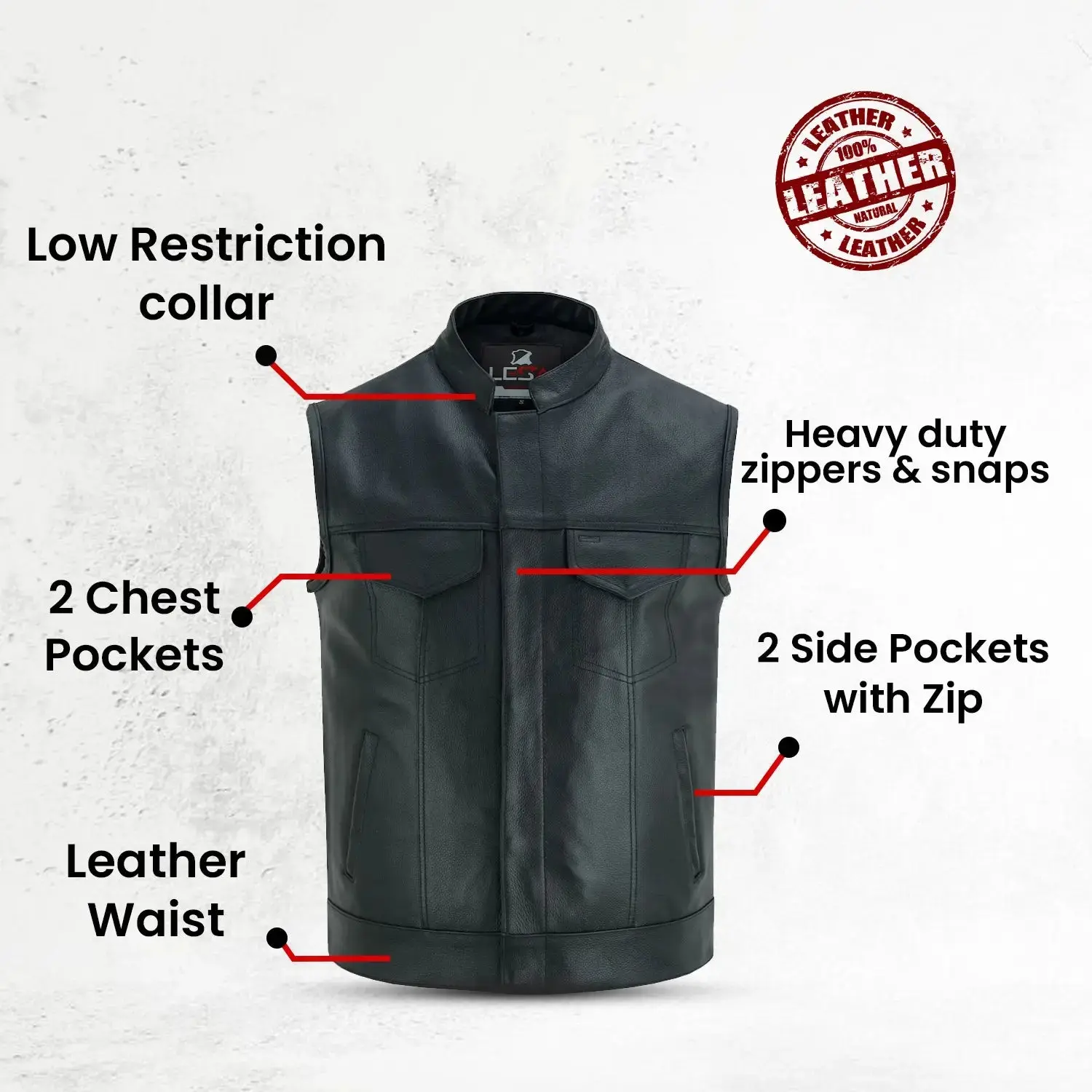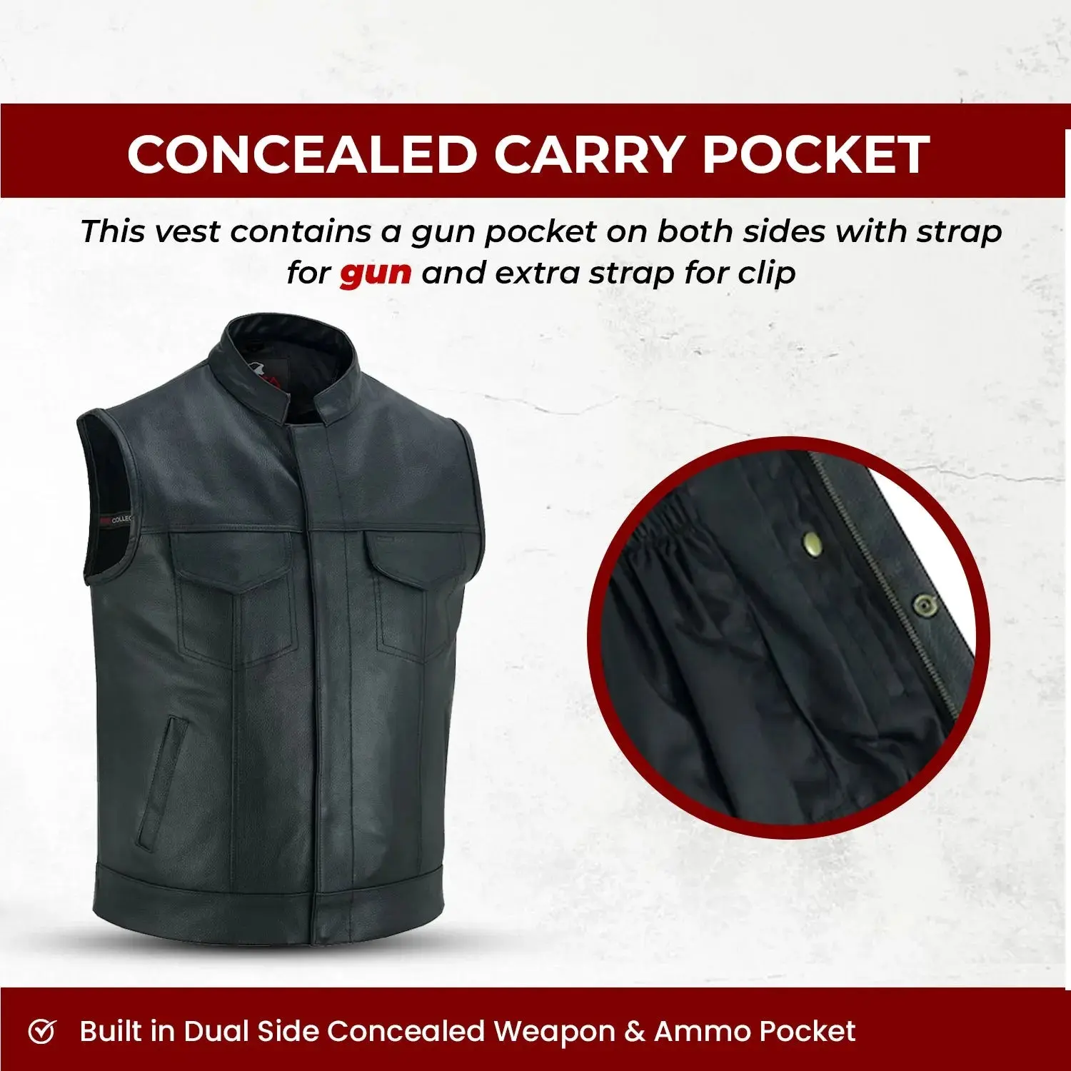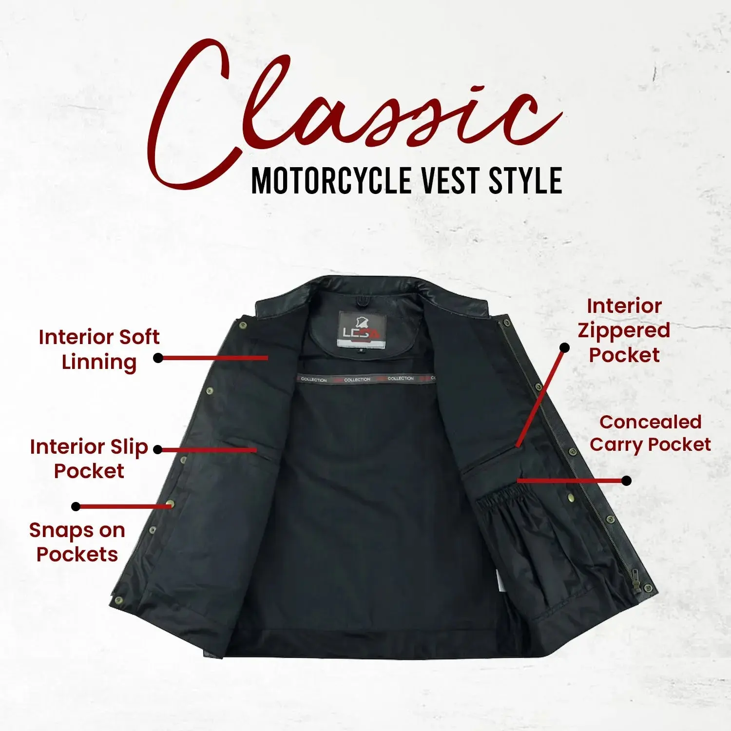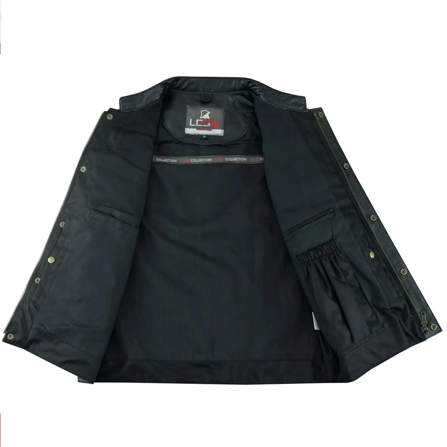 Men’s Cowhide Leather Motorcycle Vest – Black Leather Biker Vest with Collar, Zipper Snap Closure & Concealed Carry Pockets
