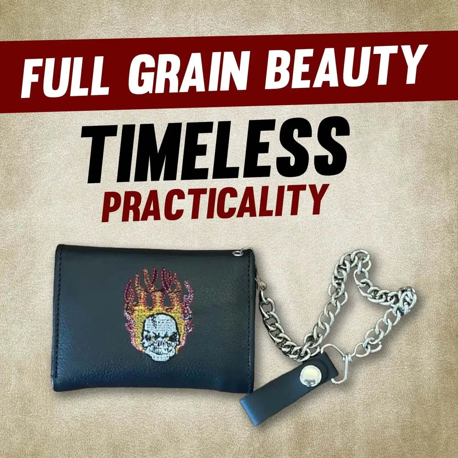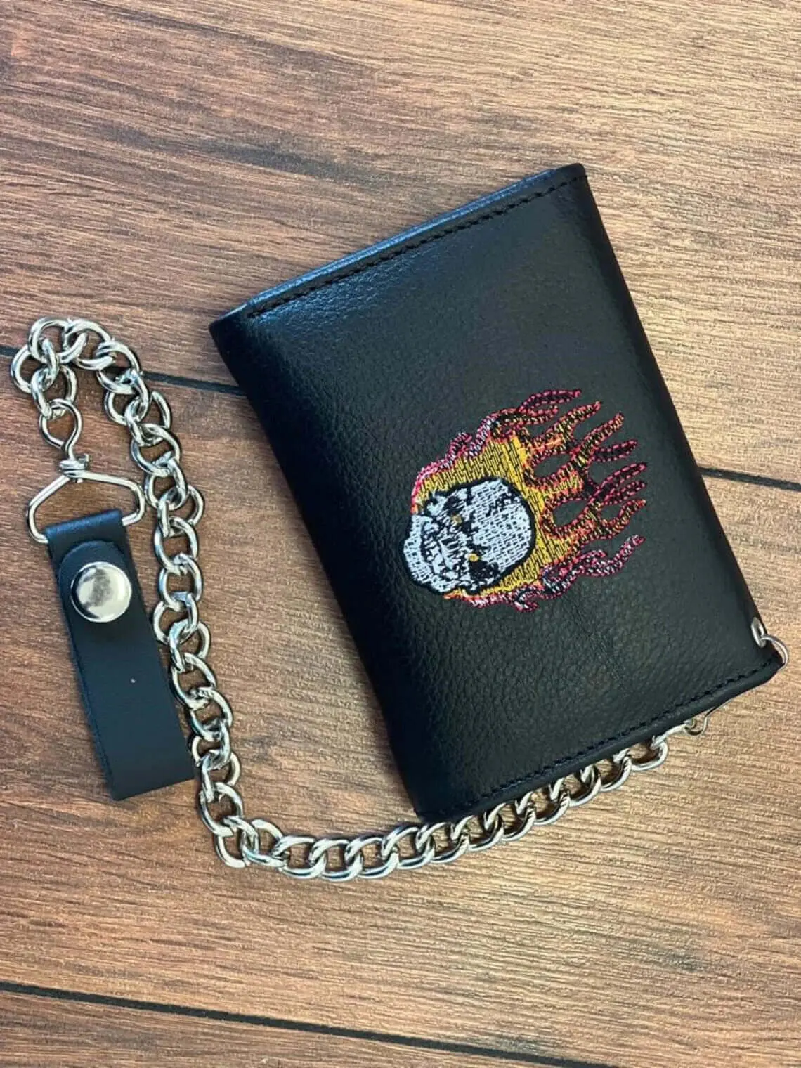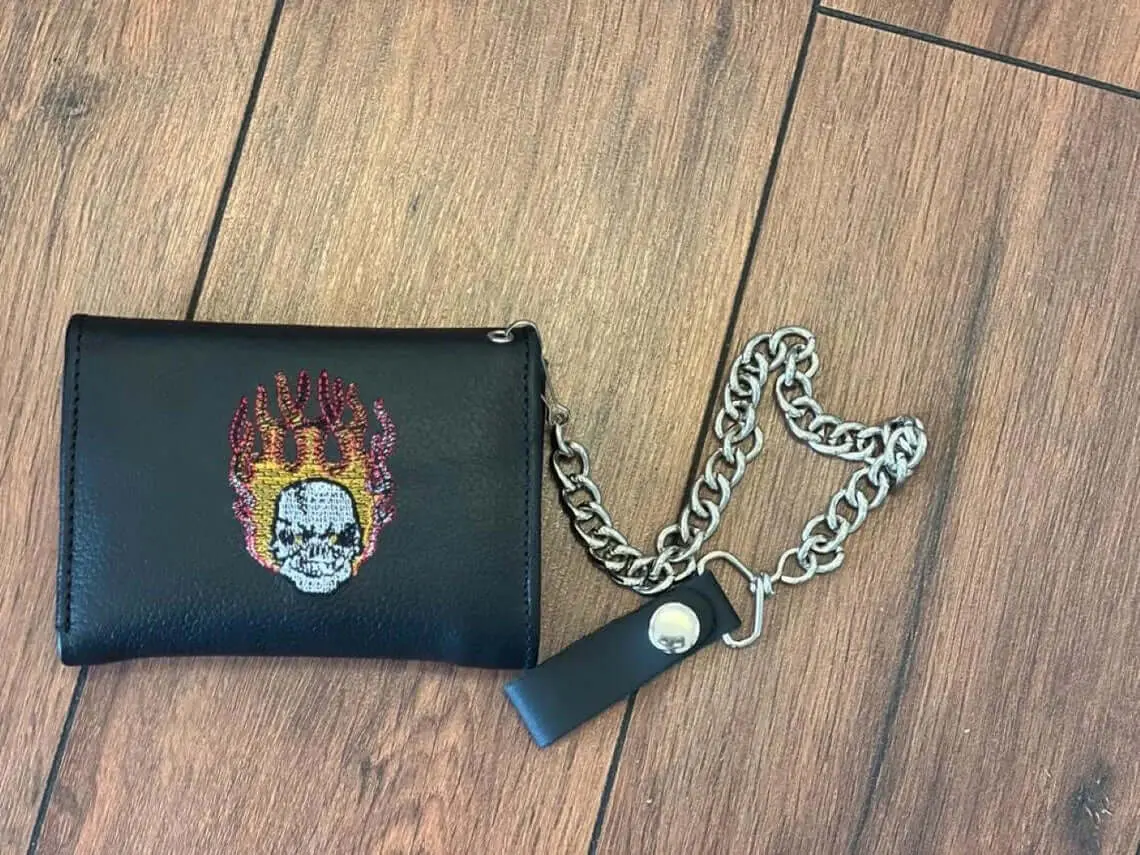Full-Grain Leather Wallet with Embroidery - Biker Wallet with Chain and Credit Card Slots