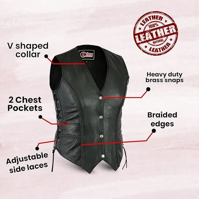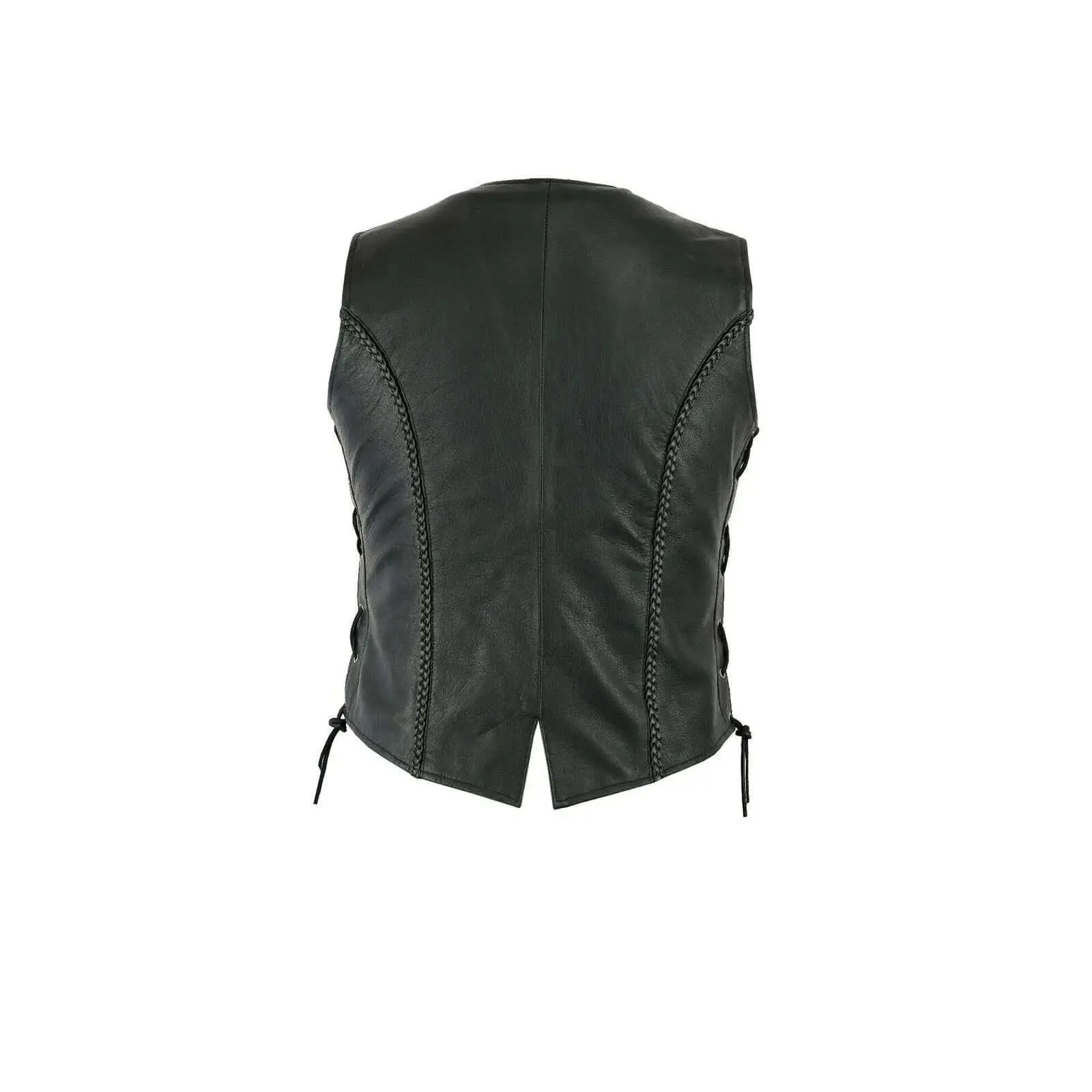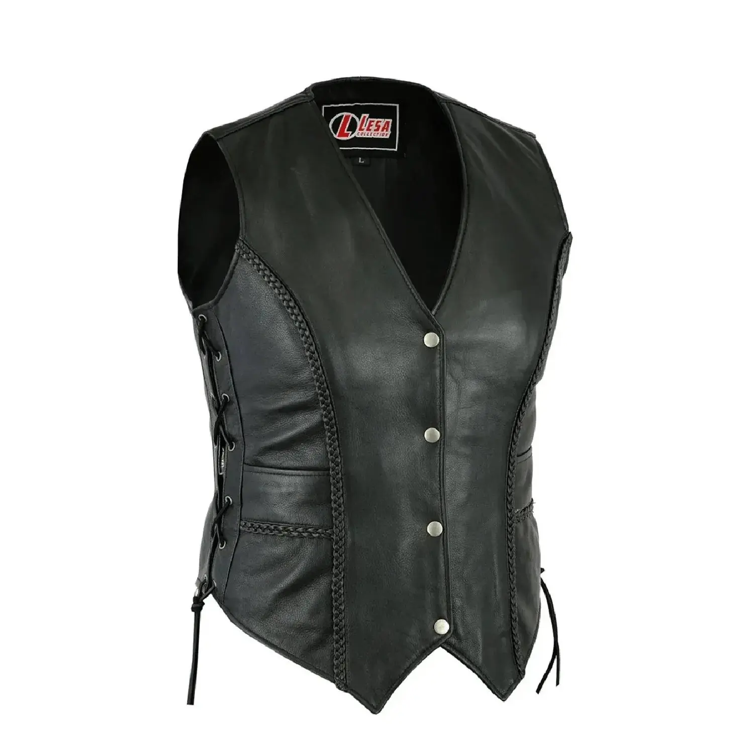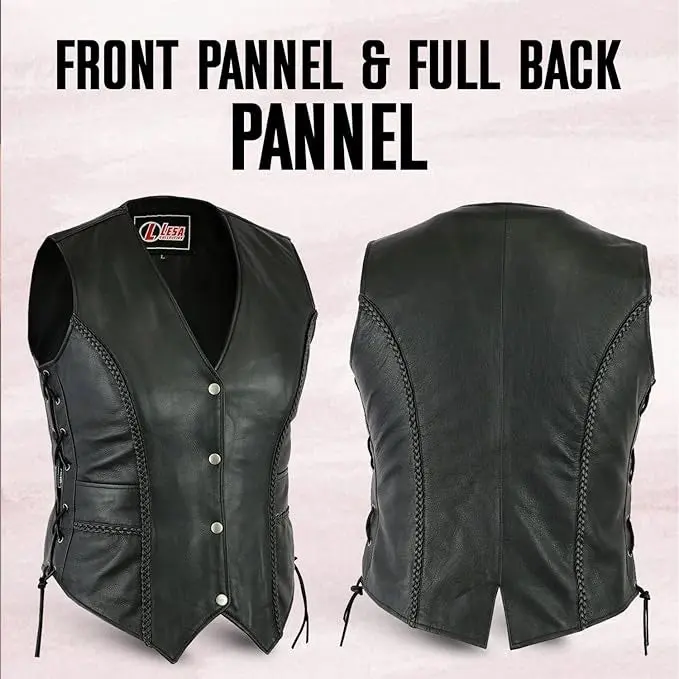 The Ladies Real Full Leather Vest provides the perfect combination of style, function, and durability. Made from quality real leather, this Vest is fashionable and will wear well over time. The special design of the front and back panels, in addition to the braided seams, offers a classy and unique design that will make you look different from the rest. Also, with a fully lined interior, the vest is comfortable enough to wear all day and looks just as good on the way to work as it does getting dressed up for going out.
