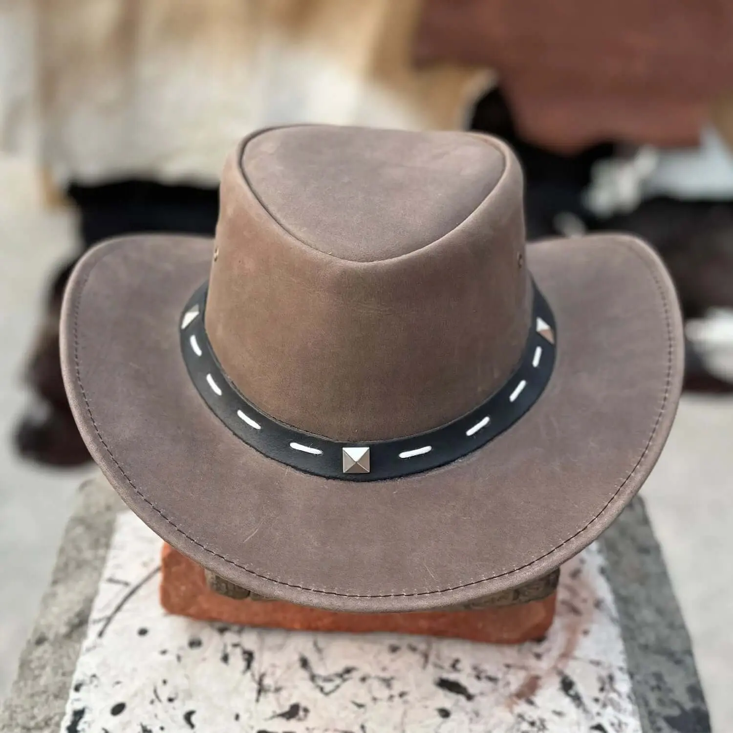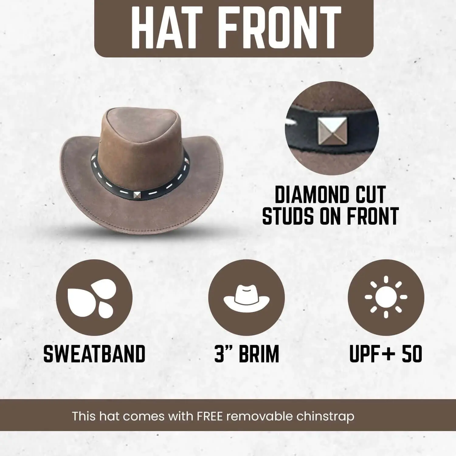With its iconic fixed leather band, shapeable brim, and removable chinstrap, the cowboy hat allows for a completely custom look and fit. The soft inner sweatband will provide comfort on hot days, and the water-resistant finish will be durable when used outdoors. Whether you are at a festival, hiking in the bush, or just out on the town, this unisex leather hat has a unique style and lots of durability.