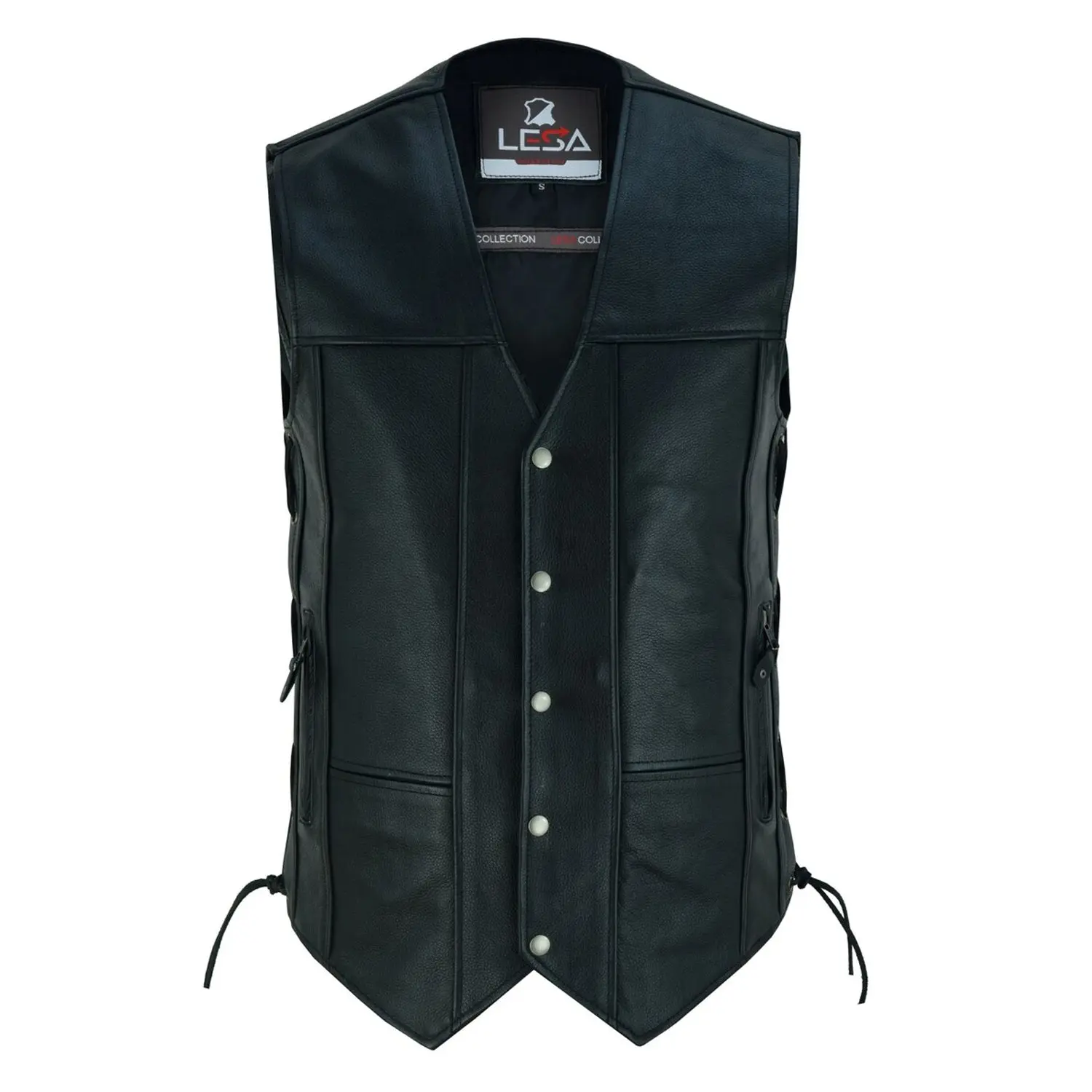 This Men’s Black Leather Waistcoat from Lesa Collection is made from premium cowhide leather for long-lasting use. Its biker-style design with a snap-front closure gives a classic, rugged look. Perfect for motorcycle rides, casual wear, or a strong fashion statement, it combines comfort, durability, and style.
