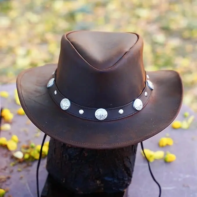 Buffalo Coin Top Grain Leather Cowboy Hat for Men & Women – Handcrafted Western Outback Hat with Shapeable Wide Brim
