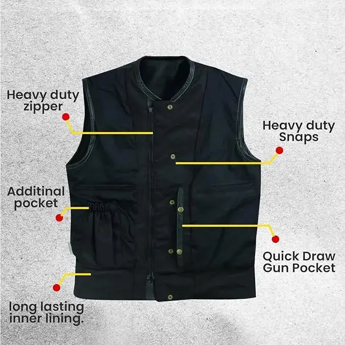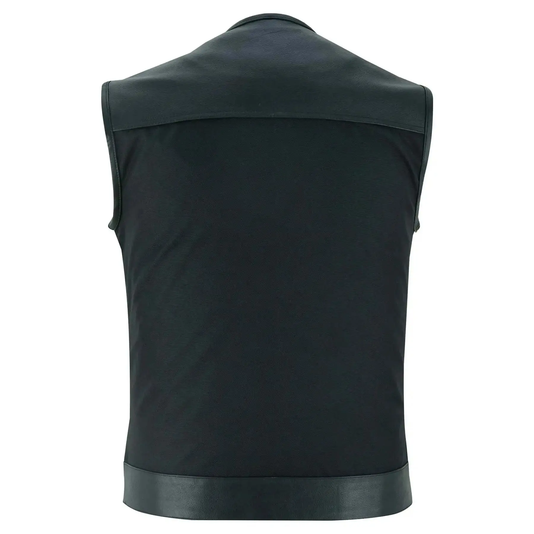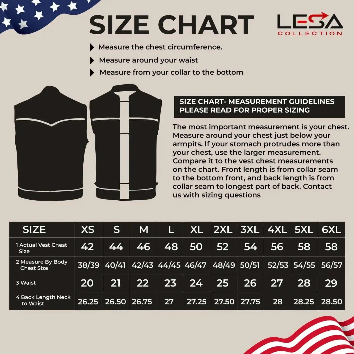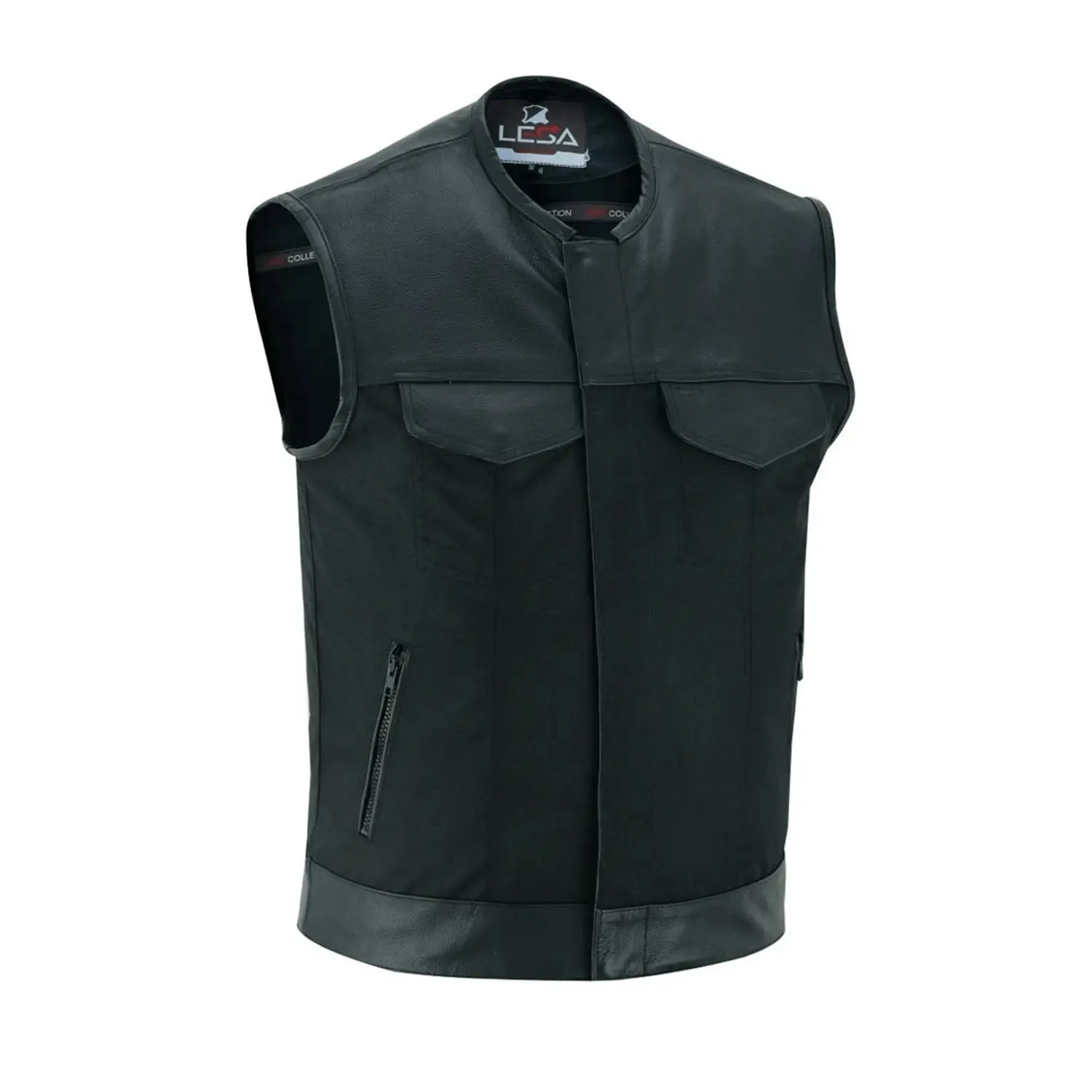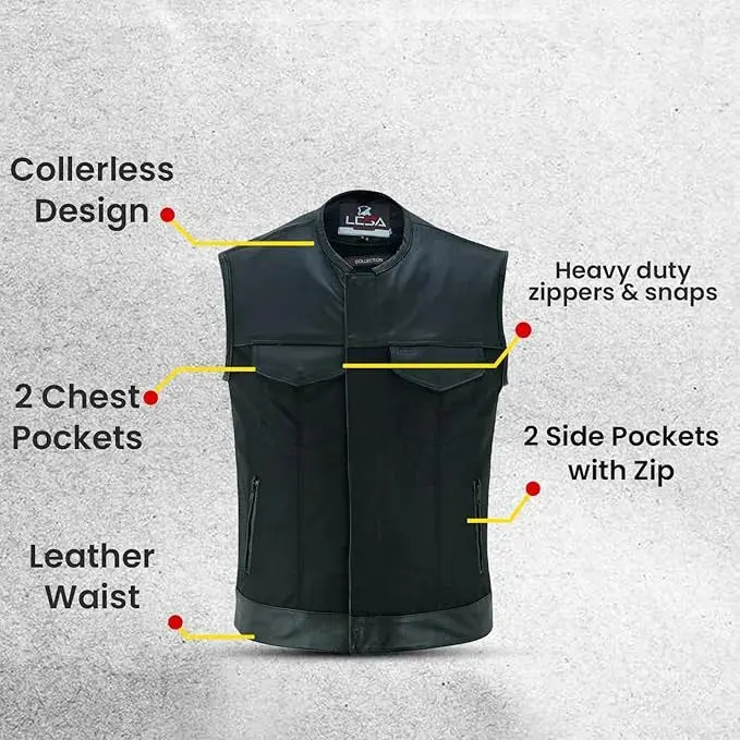 This men’s black denim motorcycle vest is made for riders who like a clean and classic look. Built with strong denim fabric and finished with cowhide leather trim, it offers both durability and style. The vest has a collarless design with plain sides, giving it a simple yet bold biker appeal. With secure snap and zipper front closure, it’s perfect to wear over a shirt or hoodie for a timeless motorcycle outfit.