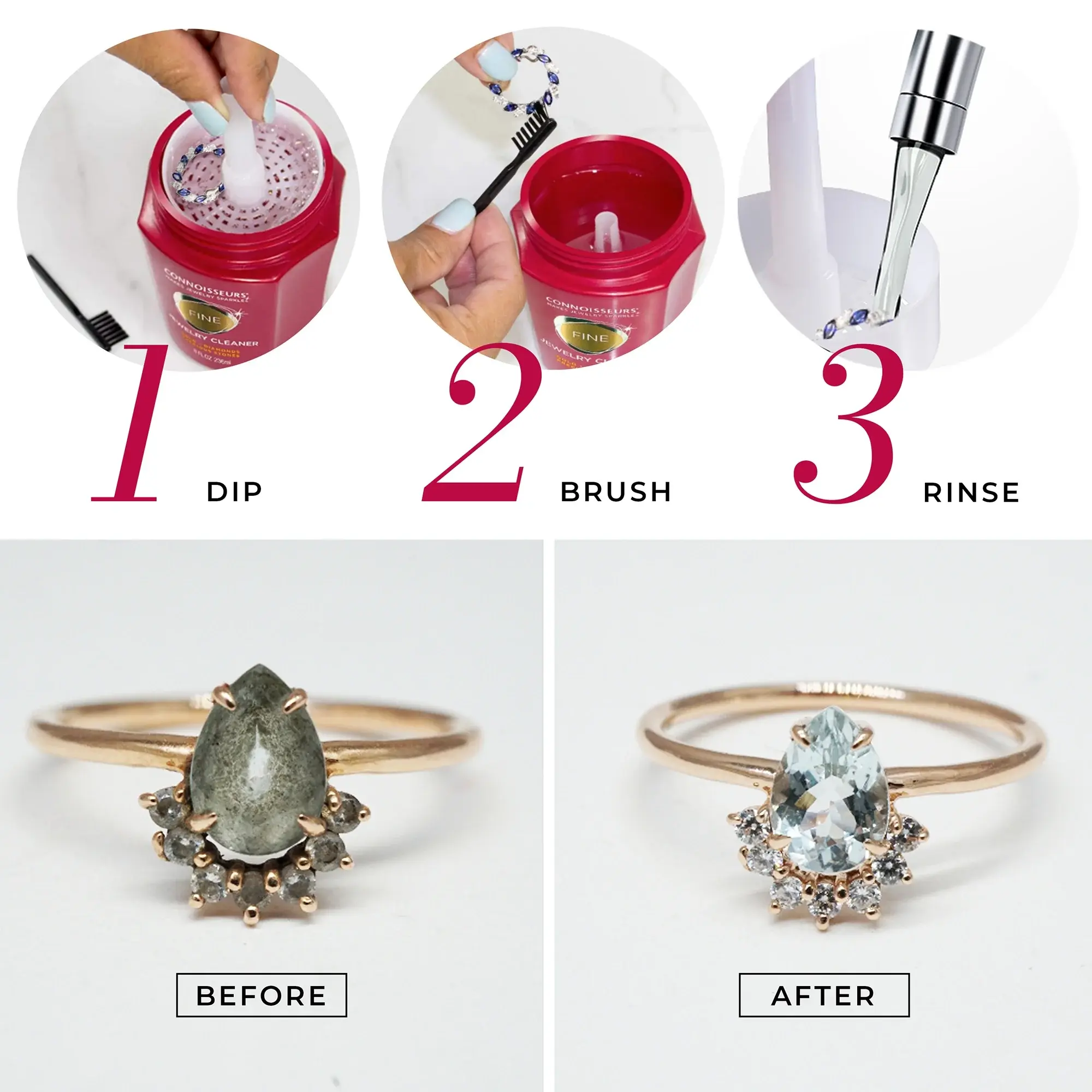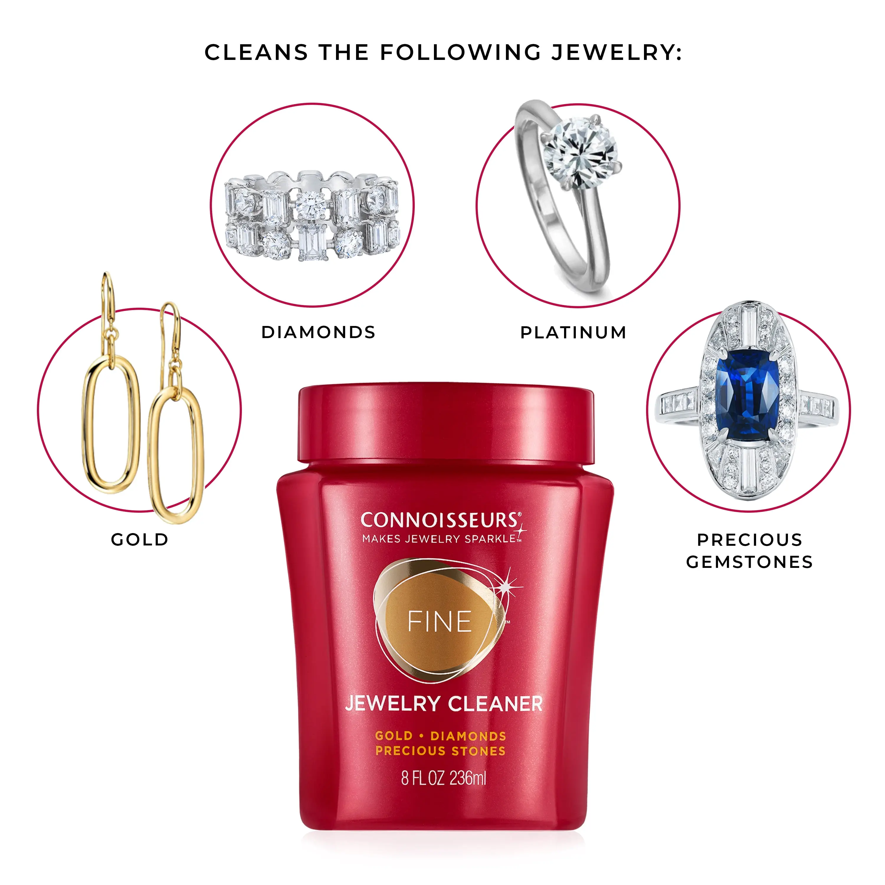 Trust the Red Jar Bring out the sparkle in your favorite fine jewelry with Connoisseurs Fine Jewelry Cleaner. This ammonia-free jewelry cleaning solution is safe for gold, platinum, diamonds, and precious gemstones, including diamond earrings, gold rings, and engagement or wedding rings. Just dip using the included tray and gently clean with the soft-bristle brush. Ideal as a diamond ring cleaner, this gold jewelry cleaner liquid formula helps reduce the appearance of fine scratches by removing and repelling dirt and oils and restoring lasting brilliance. Pair Connoisseurs jewelry cleaner solution with a jewelry polishing cloth for added sparkle. Trusted by jewelers and perfect for home use, it's the go-to solution for your most valuable pieces. Explore our Classic Red Jar Cleaner collection of Fine Jewelry Cleaner, Delicate Jewelry Cleaner, and Silver Jewelry Cleaner and discover the perfect solution for your precious pieces.