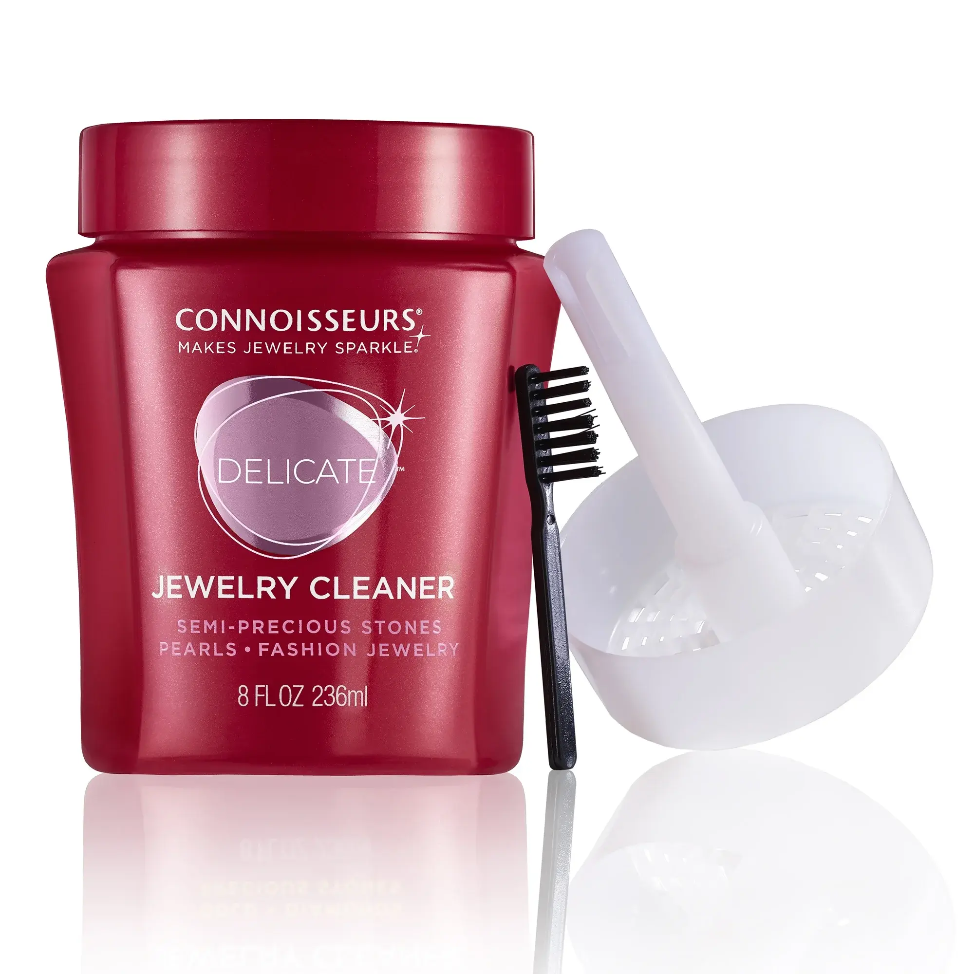 Trust the Red Jar Bring back the brilliance to delicate pieces with Connoisseurs Delicate Jewelry Cleaner. This ammonia-free jewelry cleaning solution is safe for pearls, opals, coral, onyx, turquoise, and costume jewelry, including bracelets, rings, and earrings. Just dip using the included tray and gently clean with the soft-bristle brush. Ideal as a jewelry cleaner for semi-precious stones, pearl jewelry, and fashion jewelry, this jewelry cleaner liquid formula helps reduce the appearance of fine scratches by removing and repelling dirt and oils and restoring lasting brilliance. Pair Connoisseurs jewelry cleaner solution with a jewelry polishing cloth for added sparkle. Trusted by jewelers and safe for regular use, it's the go-to cleaner for your most fragile favorites. Explore our Classic Red Jar Cleaner collection of Fine Jewelry Cleaner, Delicate Jewelry Cleaner, and Silver Jewelry Cleaner and discover the perfect solution for your precious pieces.
