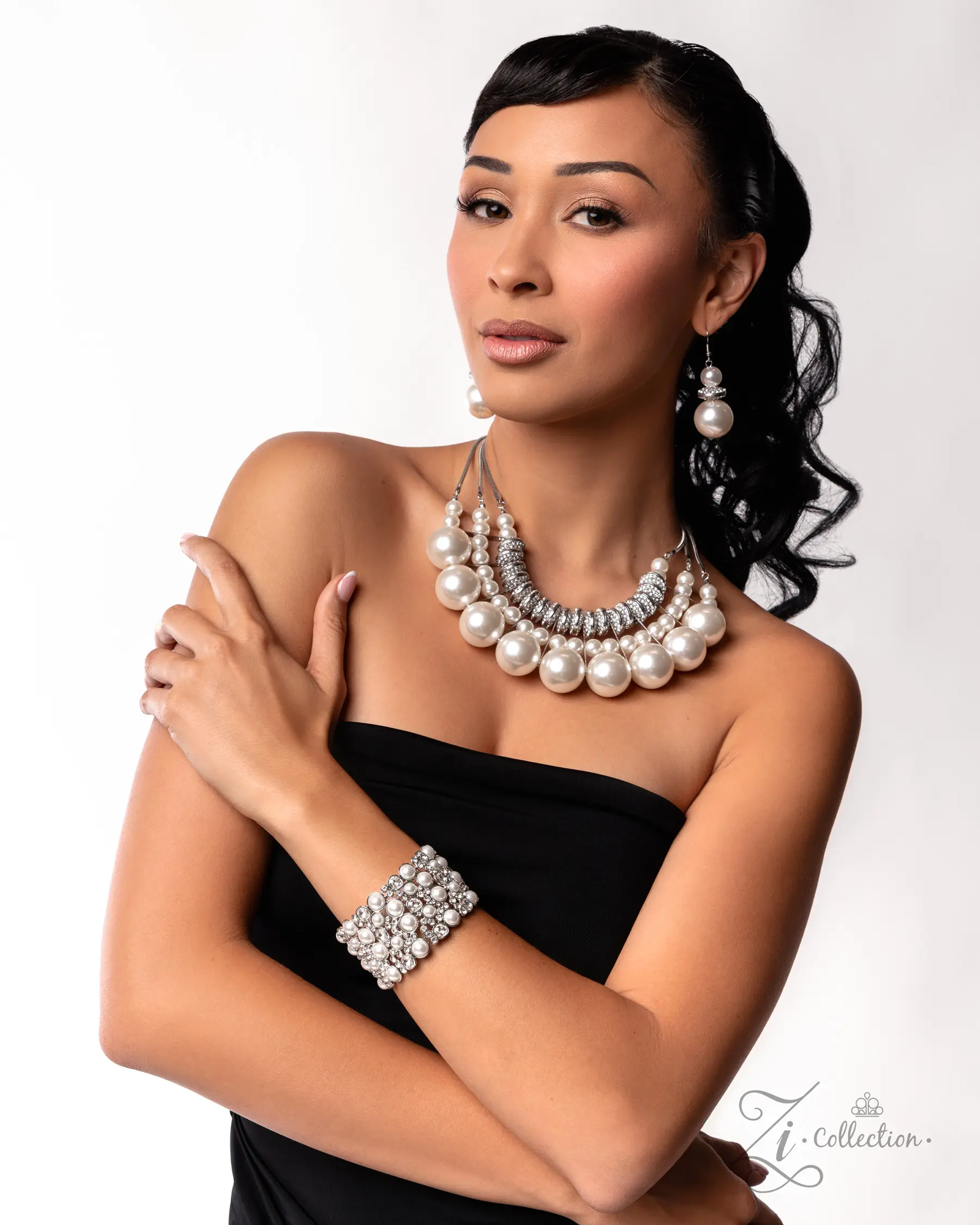 Pressed in silver fittings, white half-pearls in varying sizes drip between white gems in sleek, rounded silver square frames and staggered clusters of brilliant white rhinestones that burst with opulence across the wrist, coalescing into an unapologetically posh, layered cuff. Sold as one individual bracelet. Intended for adult use.