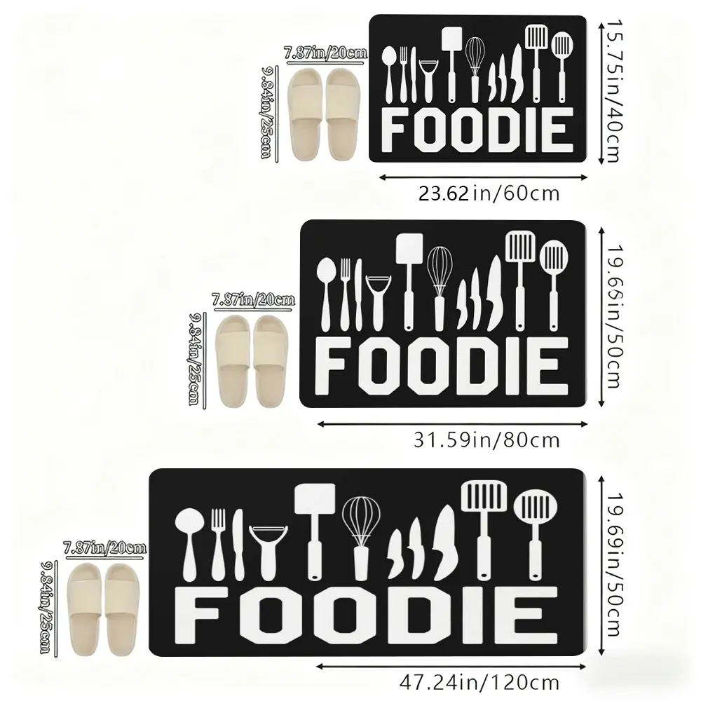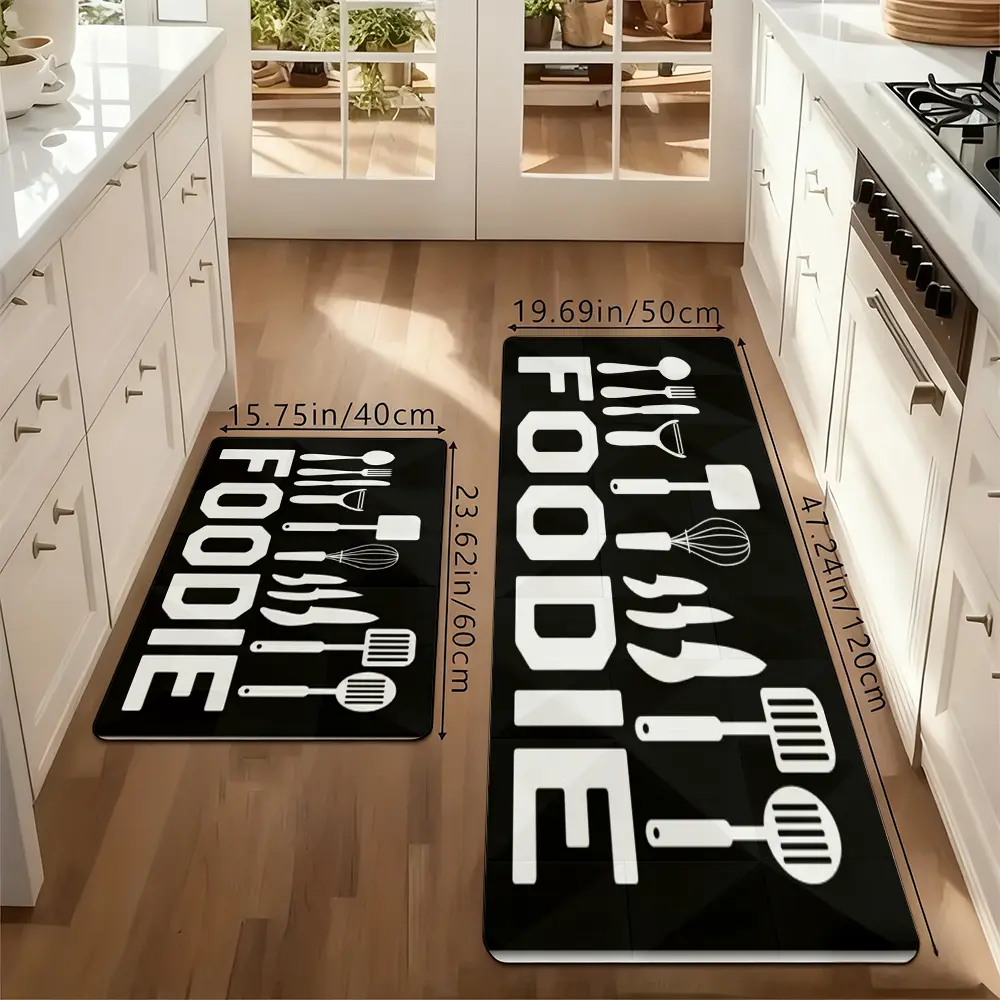 FOODIE Kitchen Rug Set, Black & White Utensil Pattern Non-Slip Washable Floor Mats, Chef Themed Runner Rugs for Kitchen, Dining Room & Home Decor