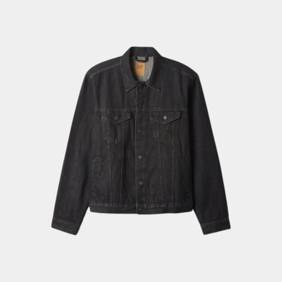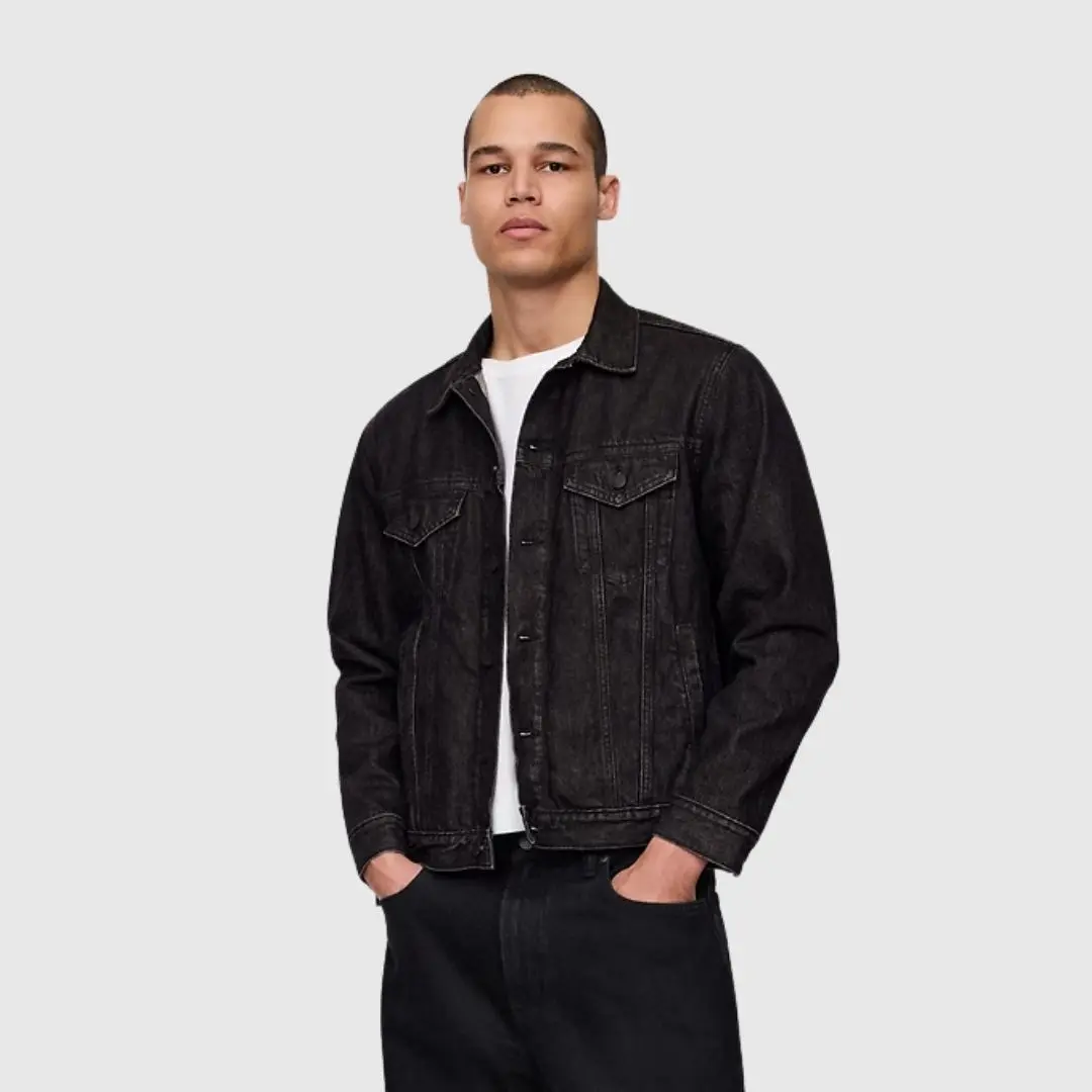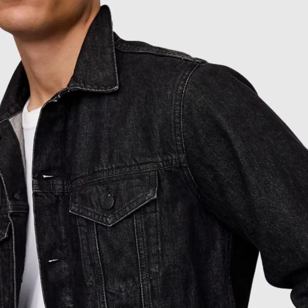 A timeless standard, this jacket is an icon passed down through generations. It's an authentic, no-stretch denim jacket in a black denim wash. Features include long sleeves, a button-front collar, and front patch pockets. Perfect for those who appreciate classic style.