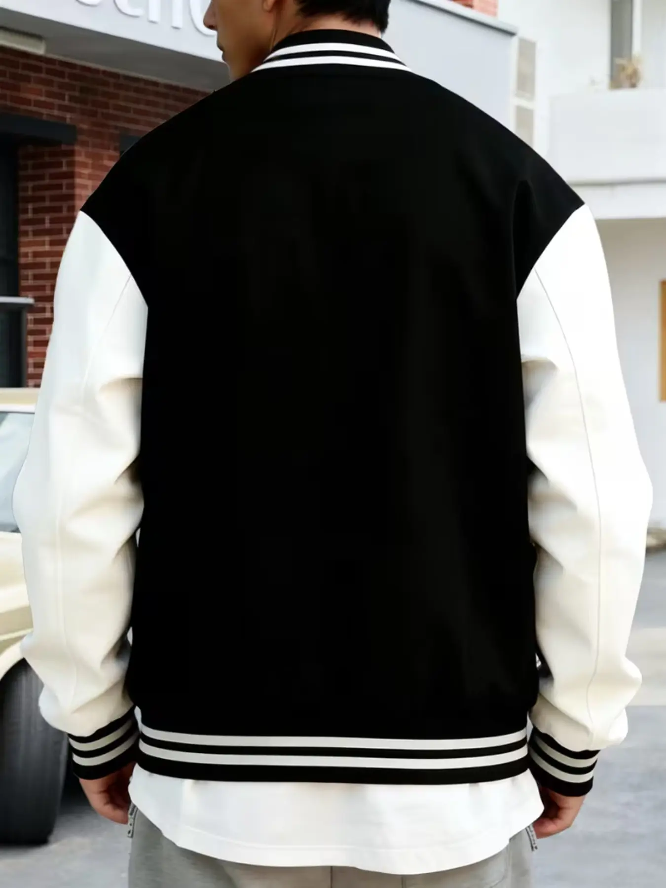 Trendy Baseball Jacket La Style, Colorblock Sleeves, Button Closure, Stretch Fabric, All Season Comfortable Outerwear, High-Quality Stitching