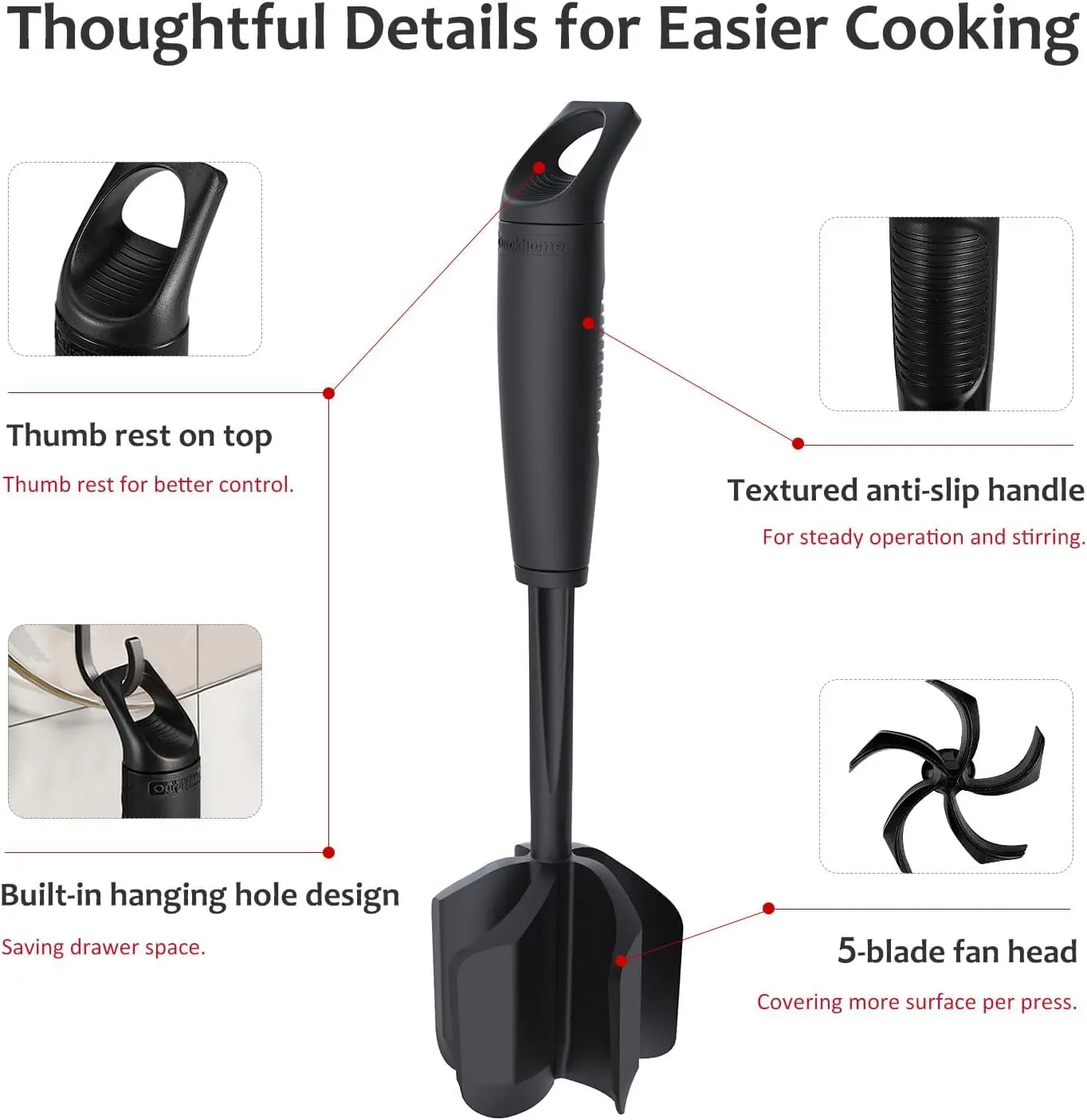 Crafted with a premium nylon head, it is completely safe for all cookware, including non-stick, stainless steel, ceramic, and cast iron—so you never have to worry about scratches. The 5 curved blades are specially designed to increase contact surface, allowing you to chop and mash food quickly and evenly in seconds.