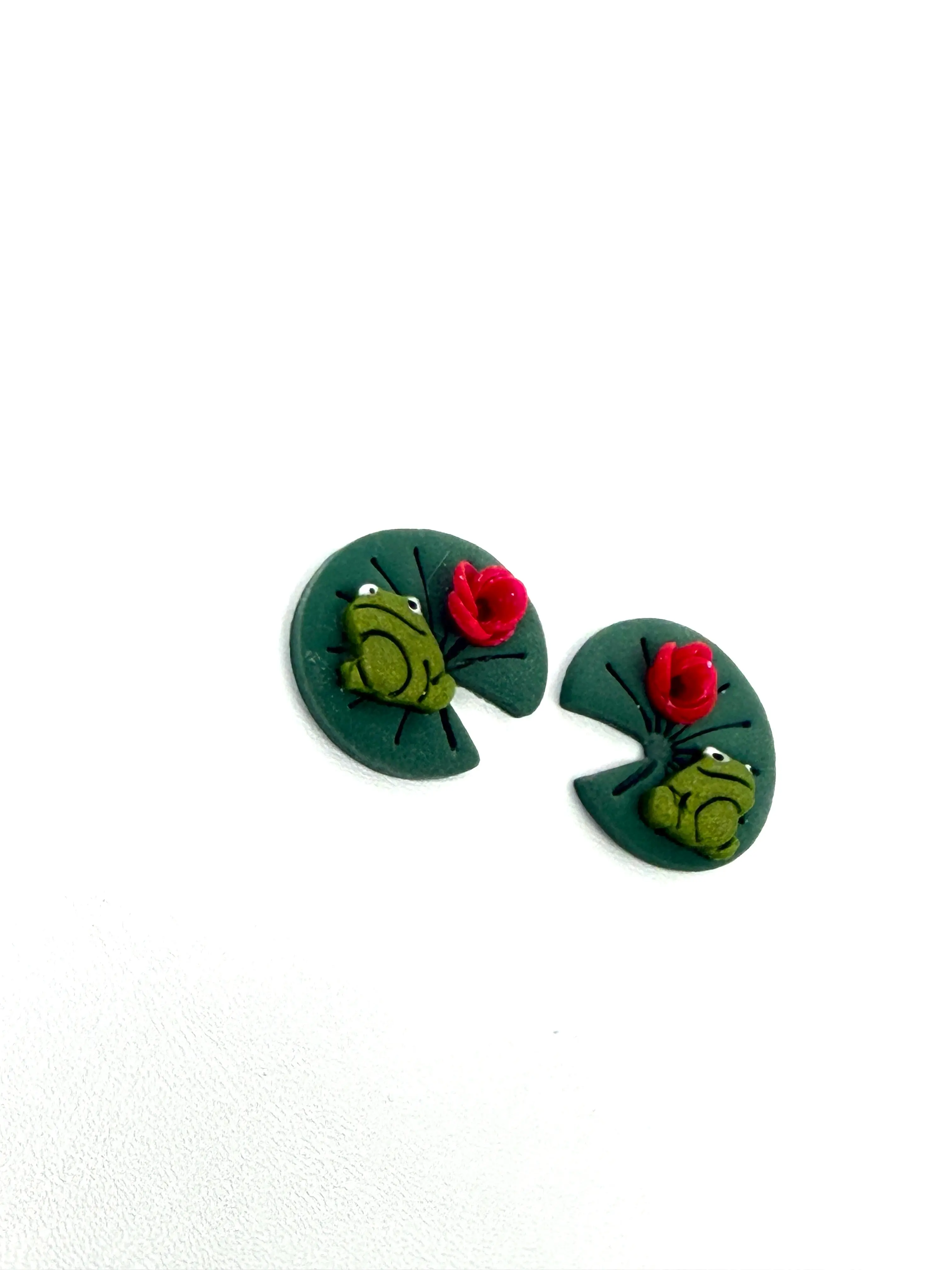 Each earring features an adorable hand-sculpted frog resting on a deep green lily pad, paired with a vibrant red flower detail. Designed with a soft, storybook feel, these studs bring a touch of enchanted forest / cottagecore vibes to any outfit.