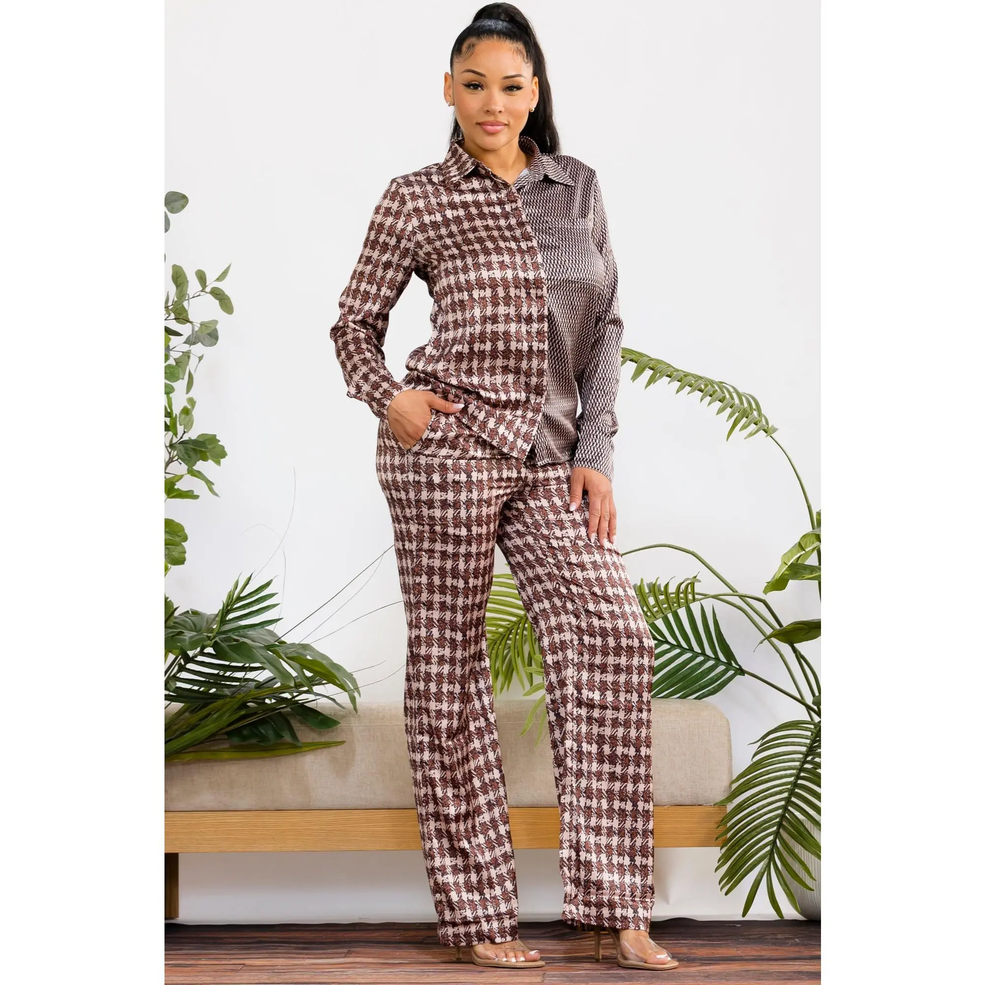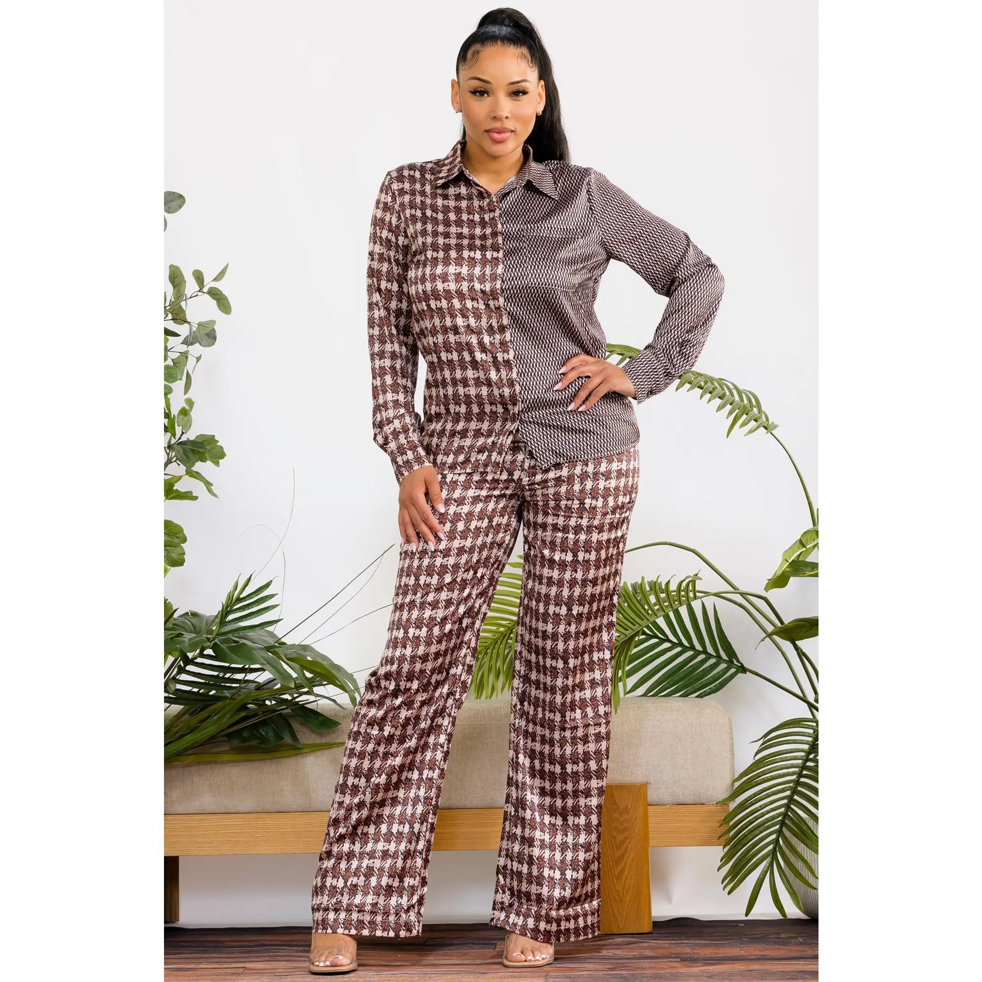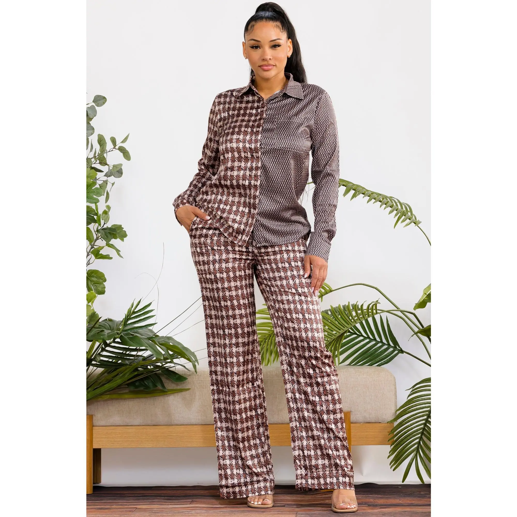 A statement two-piece set featuring a bold contrast of prints for a modern, elevated look. Designed with a relaxed button-up shirt and wide-leg pants for effortless style and all-day comfort.