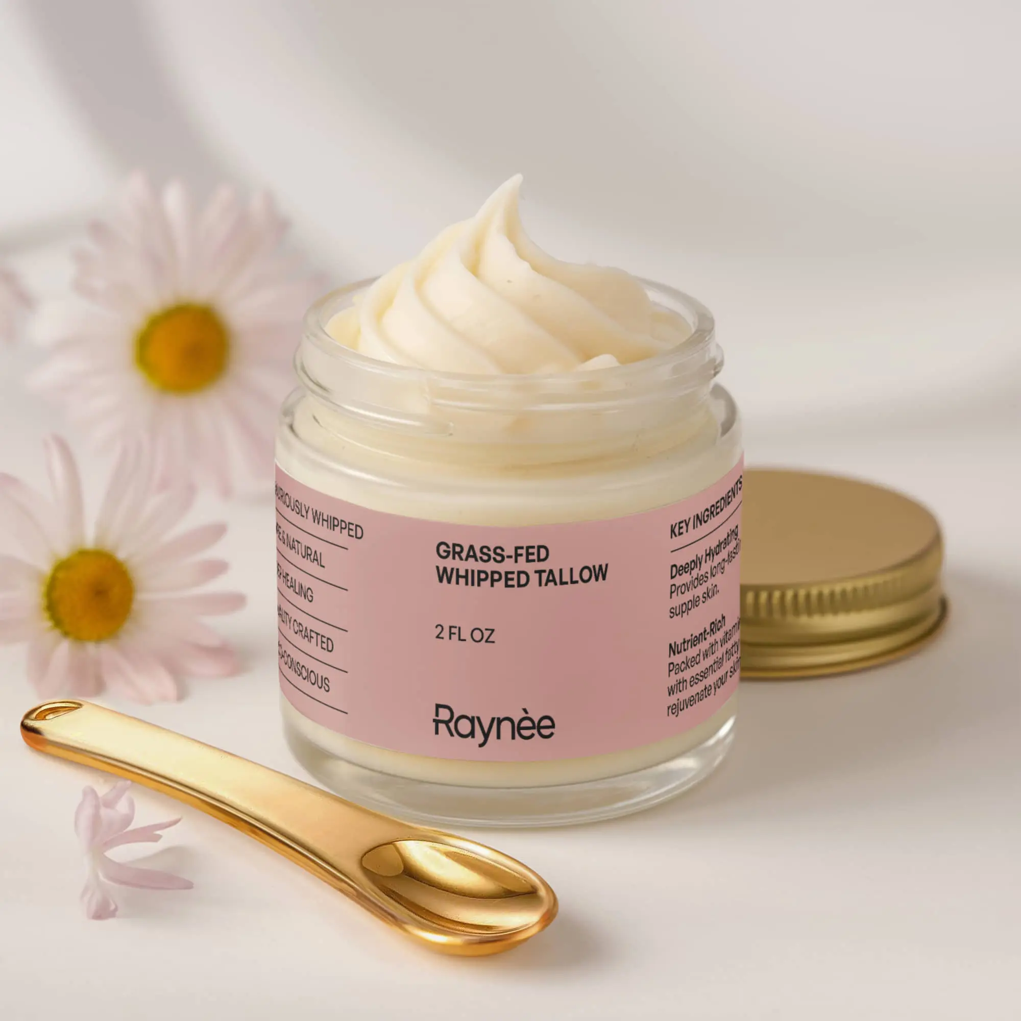 Grass-Fed Tallow – Rendered from the fat of grass-fed beef, this animal fat is rich in skin-compatible fatty acids and vitamins A, D, E, and K, deeply nourishing and repairing the skin.