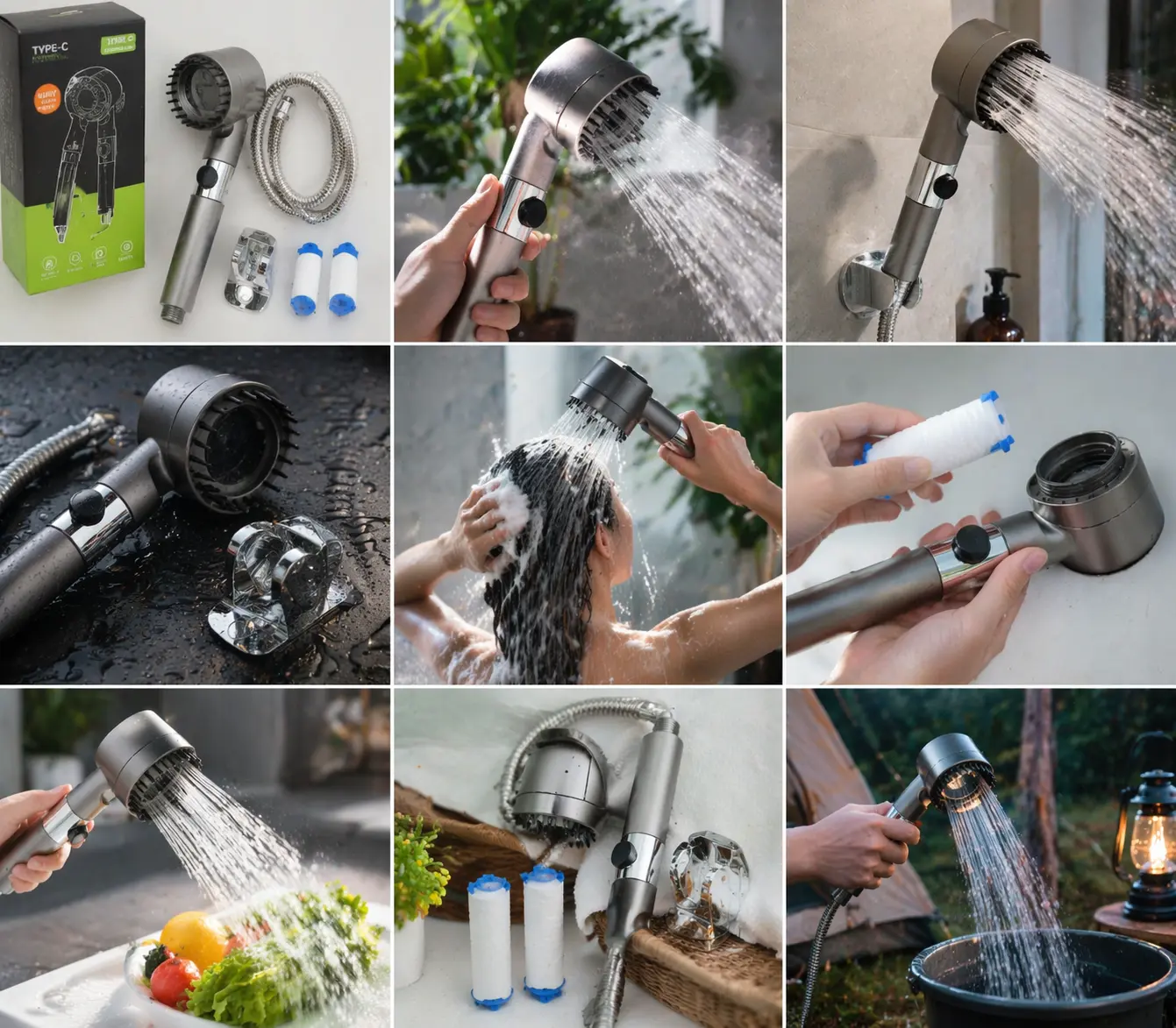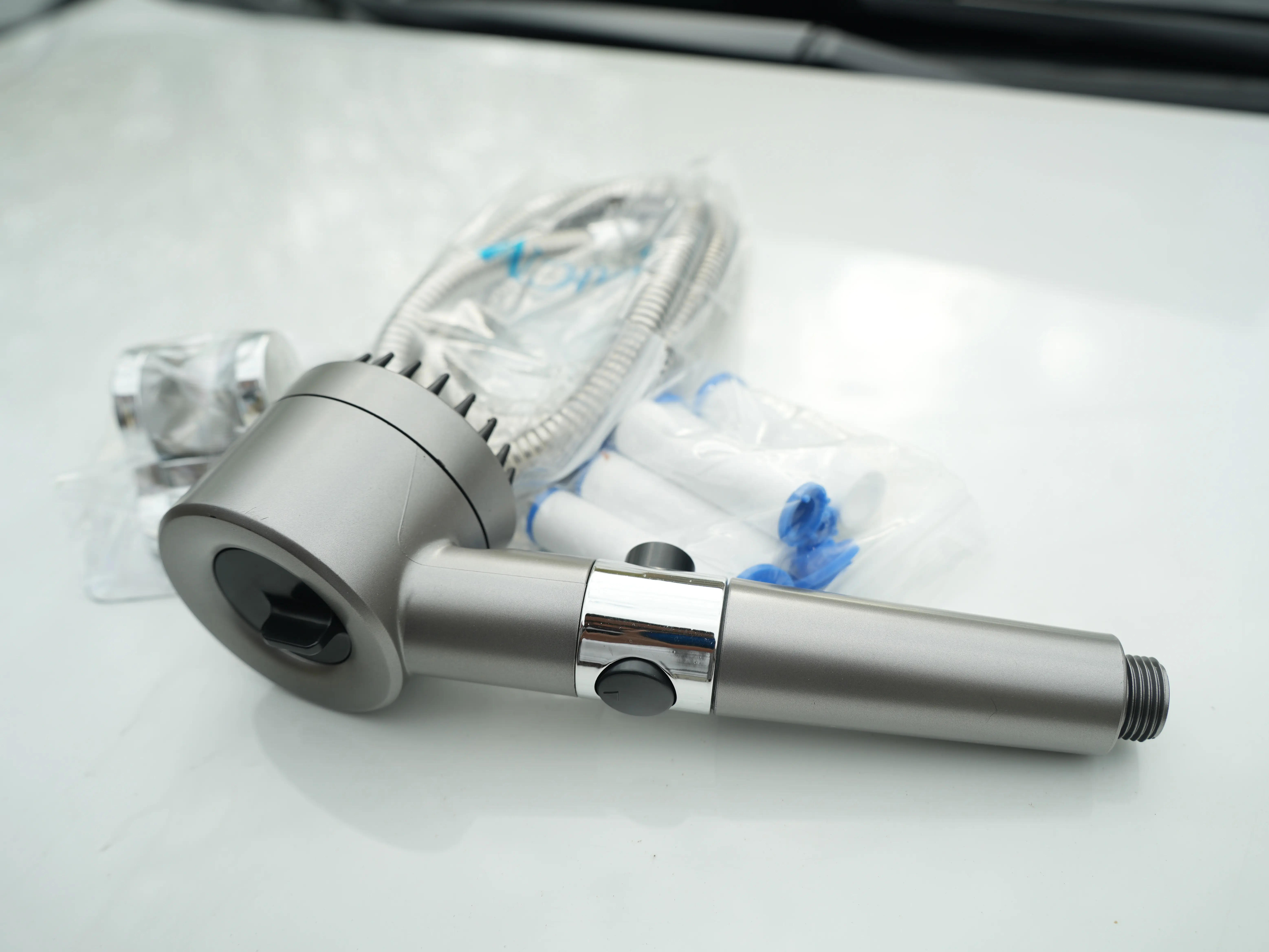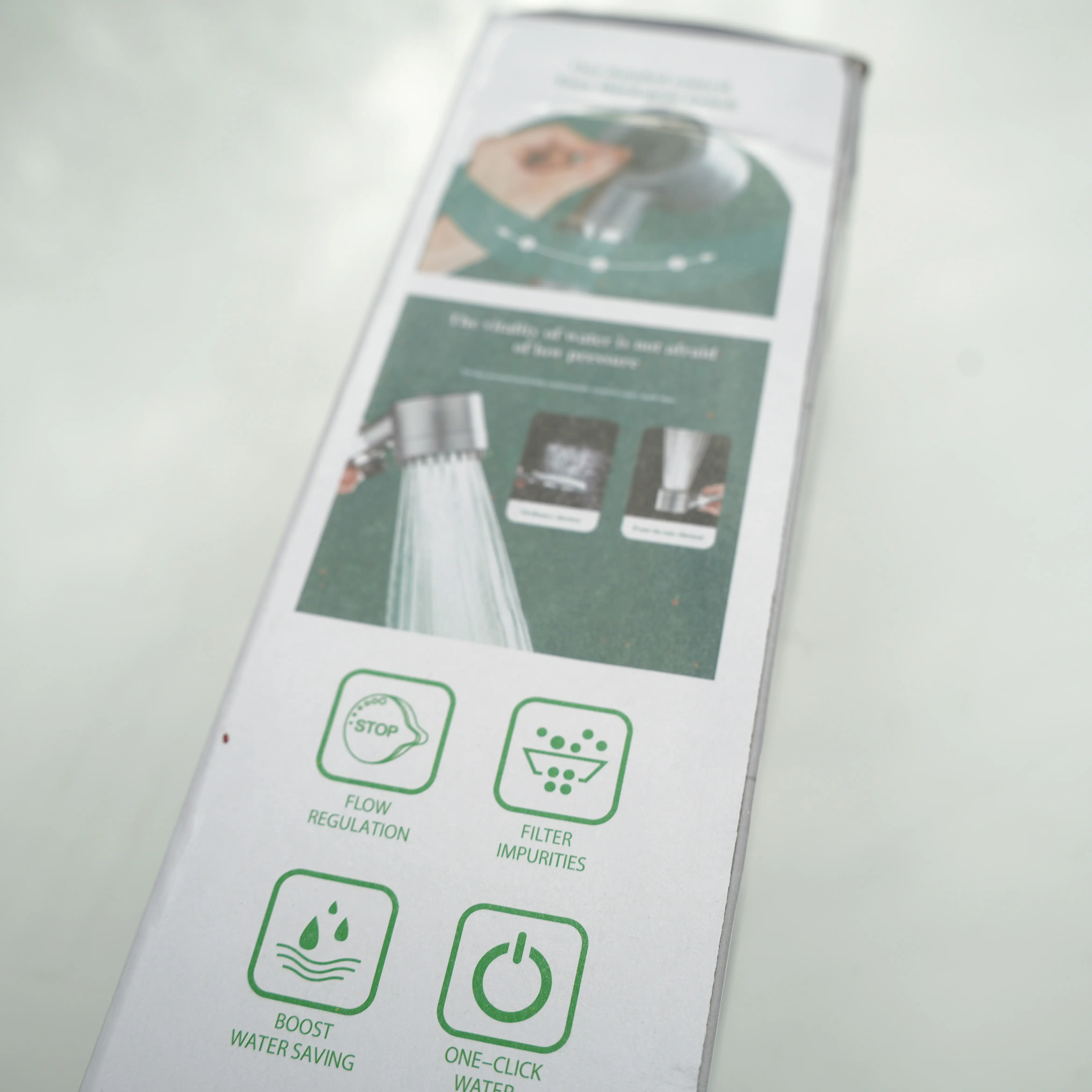 This shower head features flow regulation, ensuring a consistent water stream. It filters impurities, providing cleaner water. Boost your water-saving efforts with its efficient design. One-click operation makes it user-friendly.