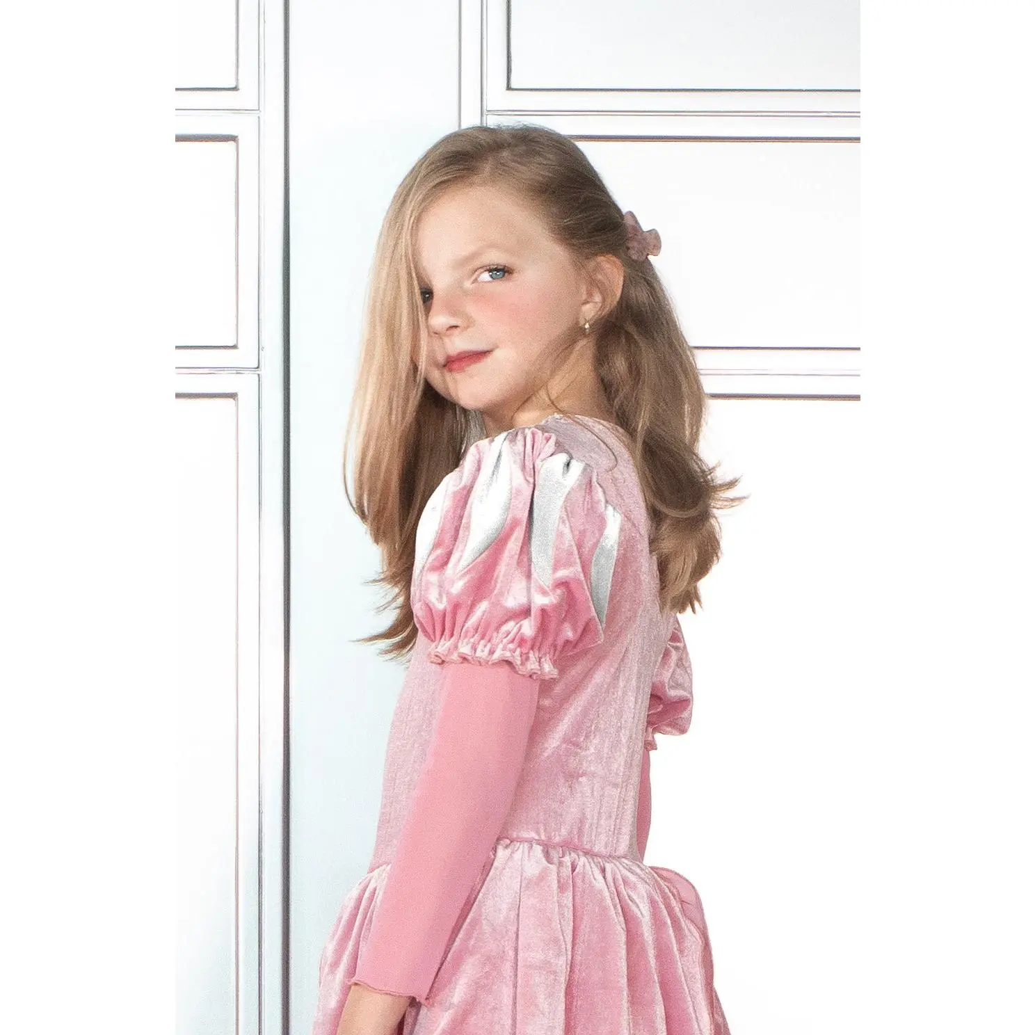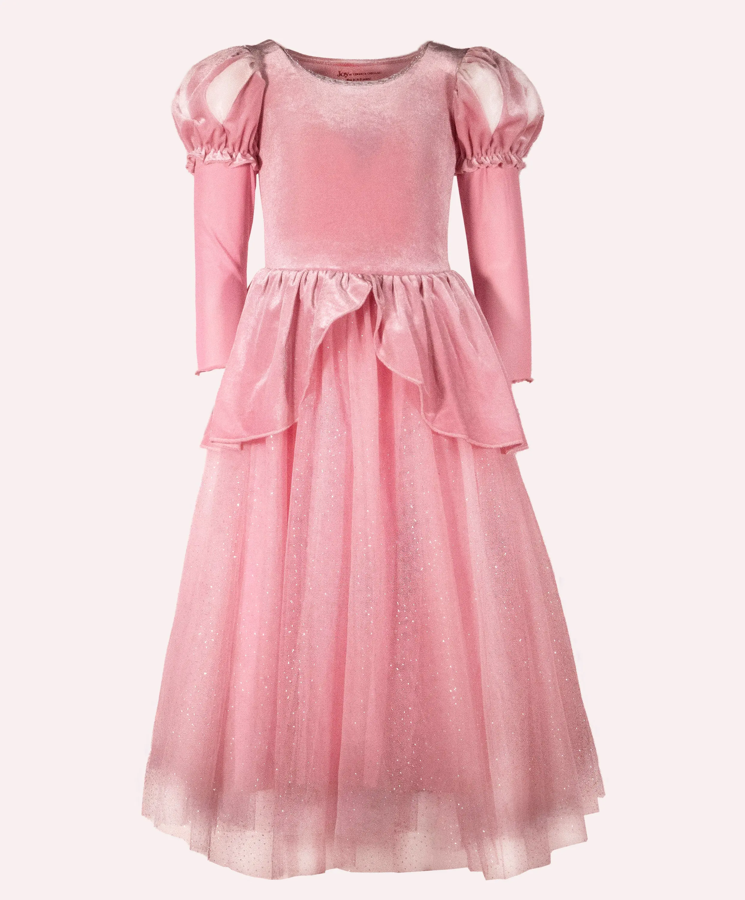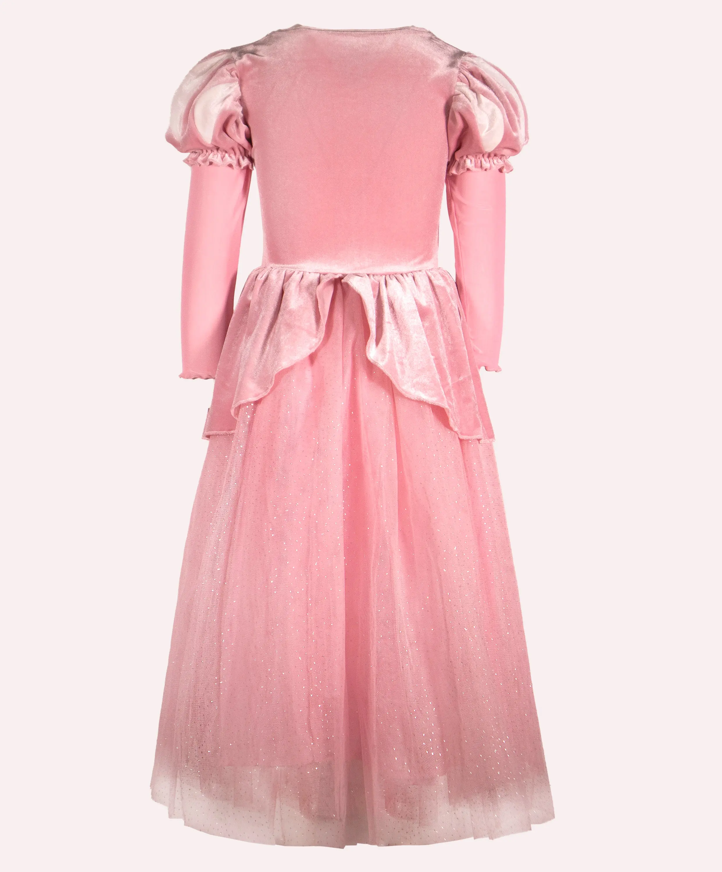 The bodice of the dress is made from a soft and super stretchy velvet material in a light pink shade. The neckline is adorned with a silver seashell trim, and the dress features gorgeous, puffed bi-colored paned sleeves. The long sleeves are made from a soft thin mesh fabric. The skirt is created using multiple layers of sparkly tulle that match the bodice's pink tone. A velvet peplum overlays the skirt, parted in the center front, giving it a stunning finishing touch.