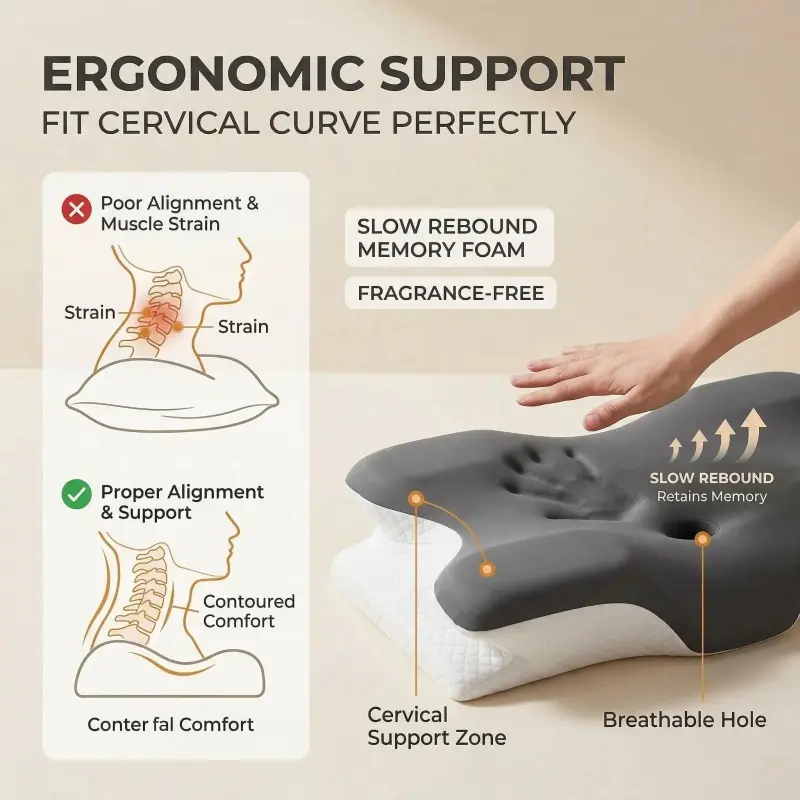 Orthopedic Neck Pillow for Pain Relief Cervical Support Memory Foam Contour Design Cooling Pillowcase Ideal for Side Stomach Back Sleepers