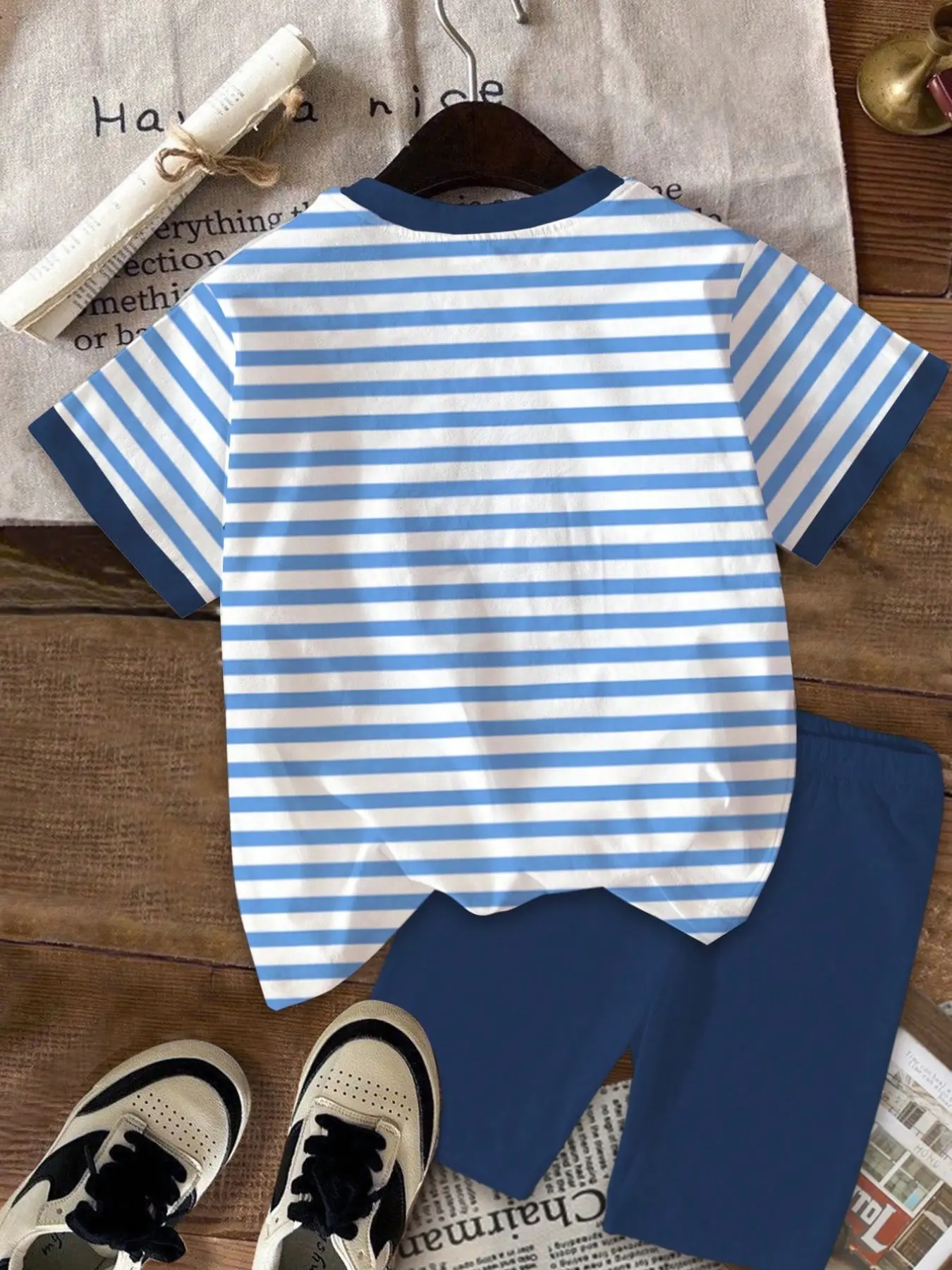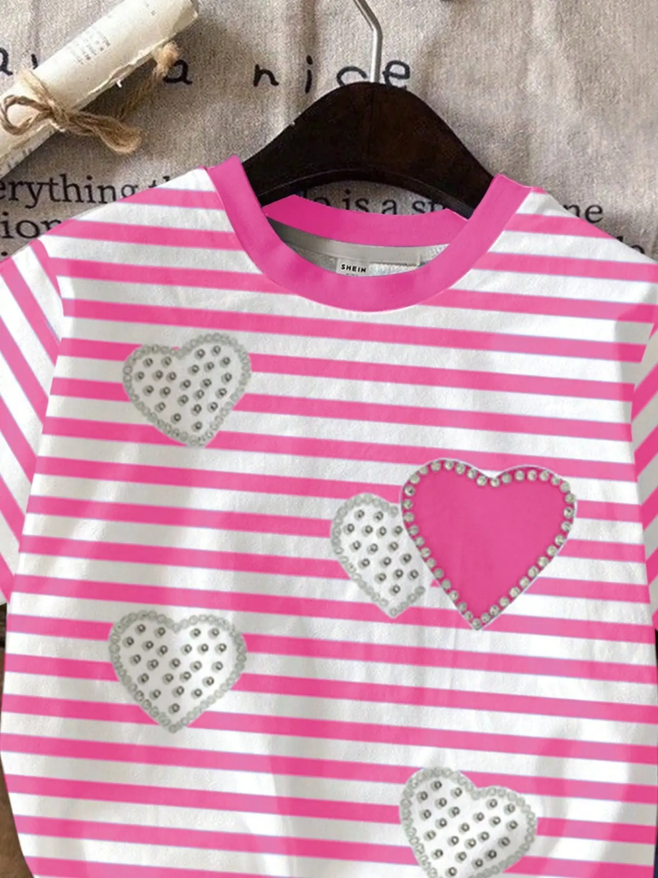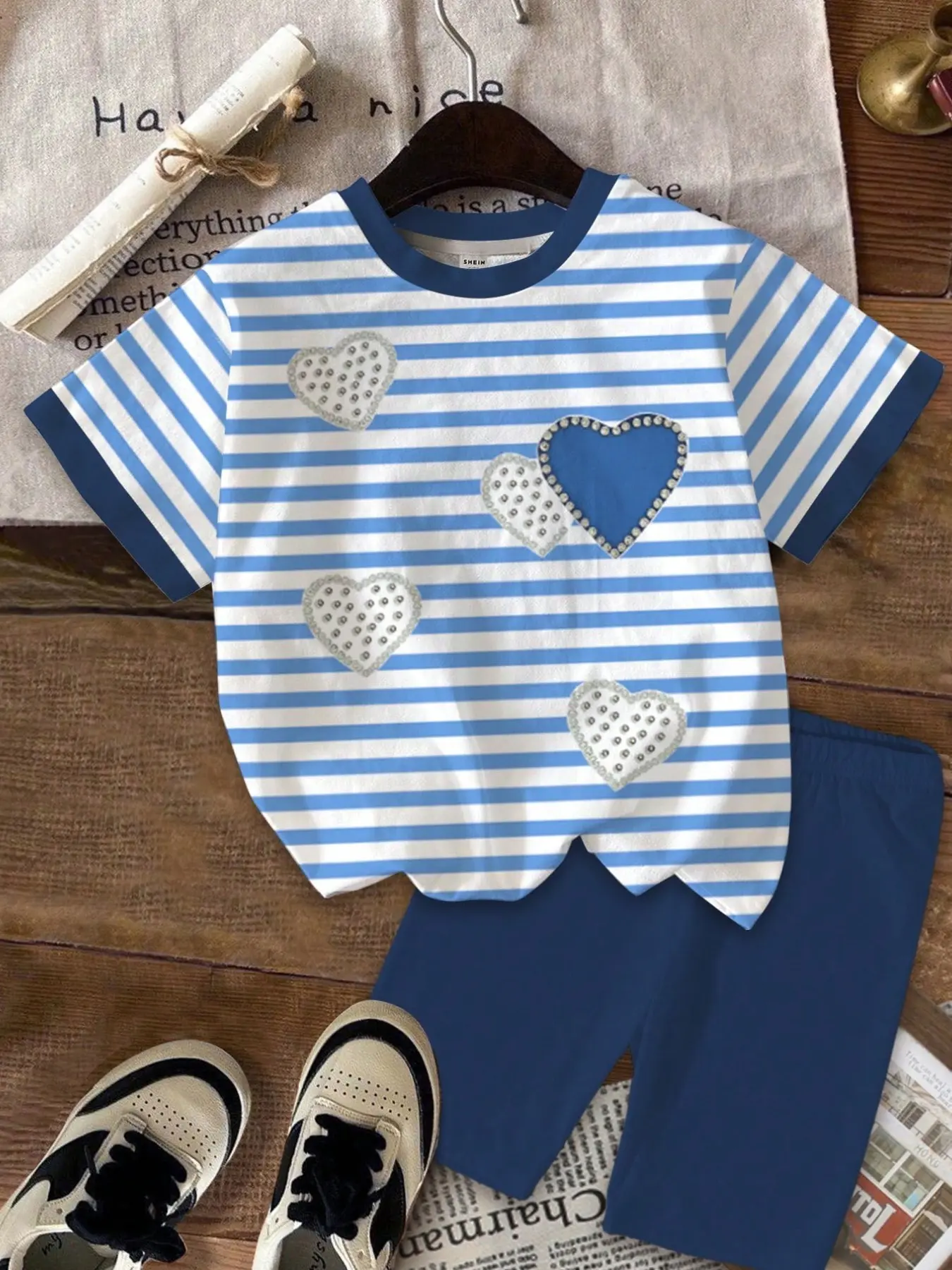 Girls' 2-Piece Set Summer, Striped Heart Print T-Shirt & Shorts, Casual Everyday Wear, Perfect for Parties & Holidays