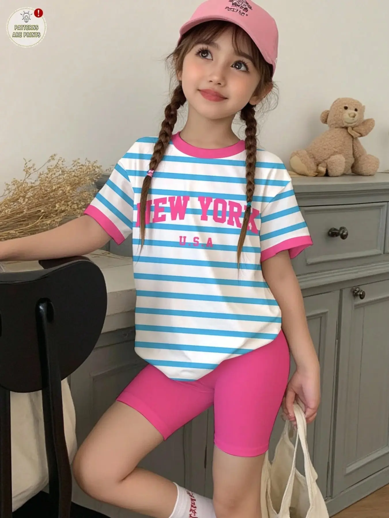 5. Girls' 2-Piece Set Summer, Striped Heart Print T-Shirt & Shorts, Casual Everyday Wear, Perfect for Parties & Holidays