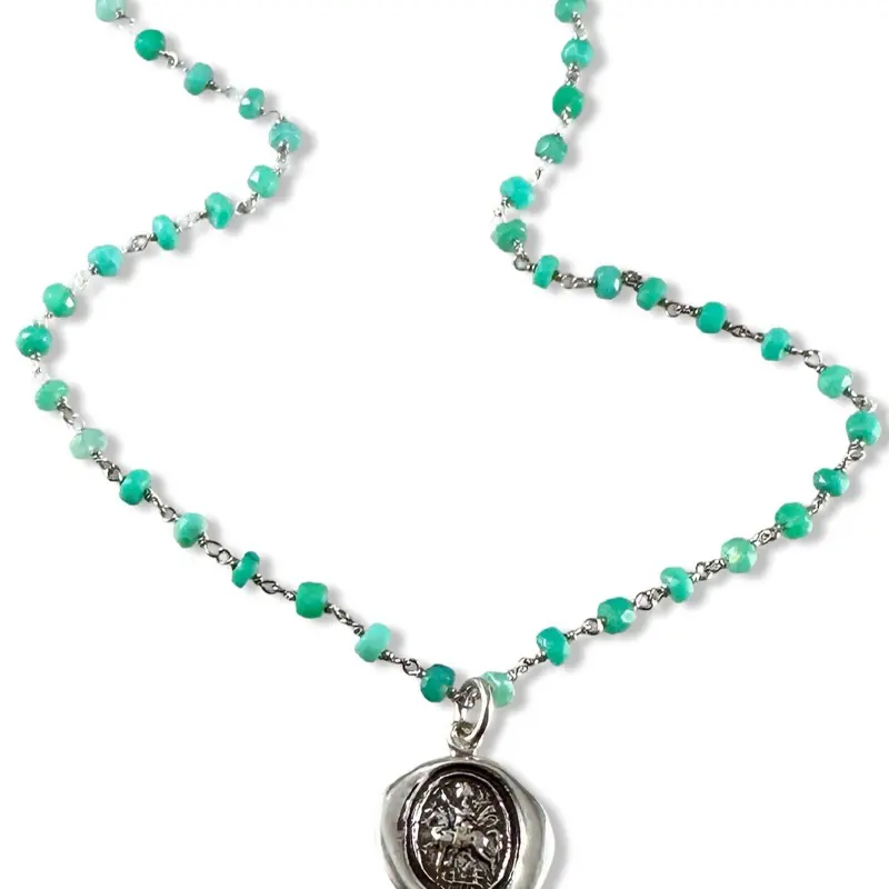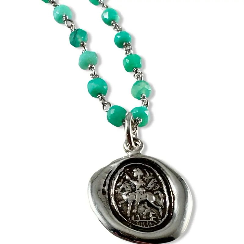 Sterling Silver Saint George pendant on our 18" faceted sterling silver wrap gemstone necklace.