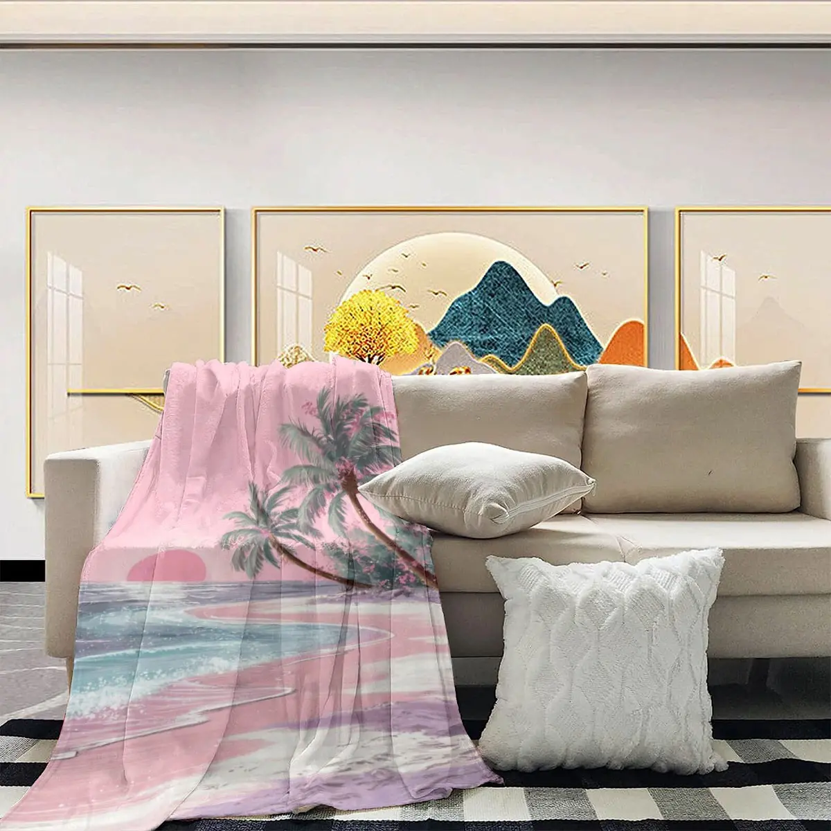 Comfortable Flannel Blanket, Beach Theme Coconut Grove Sunset Pattern, Digital Print, Ideal for Living Room and Camping