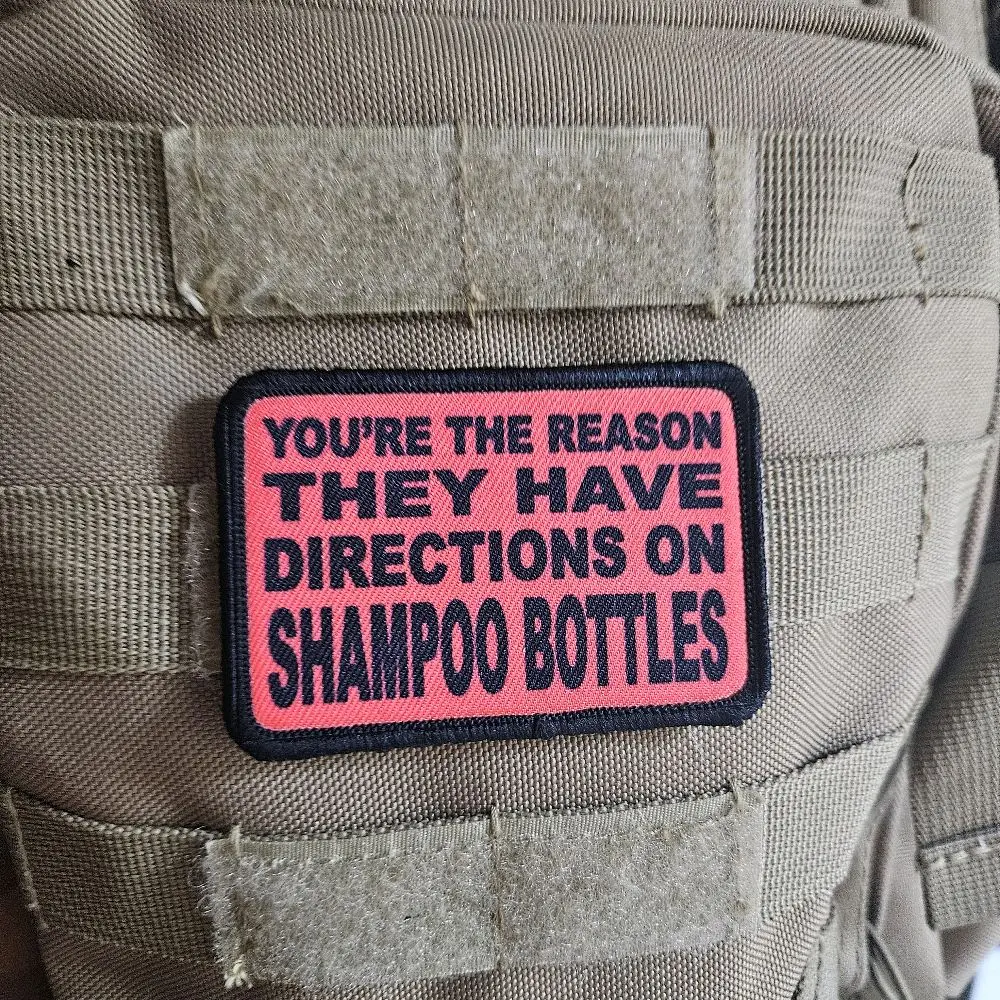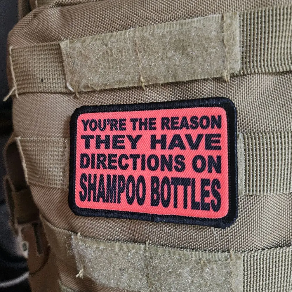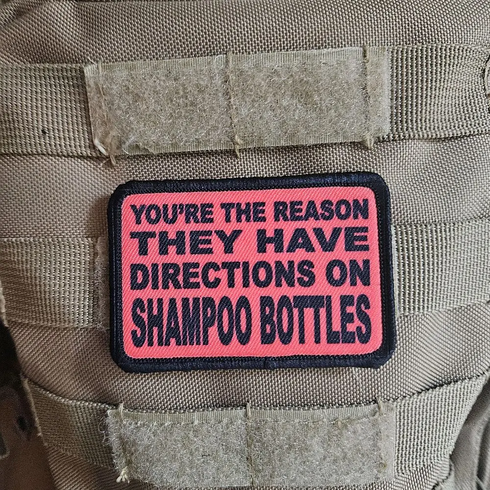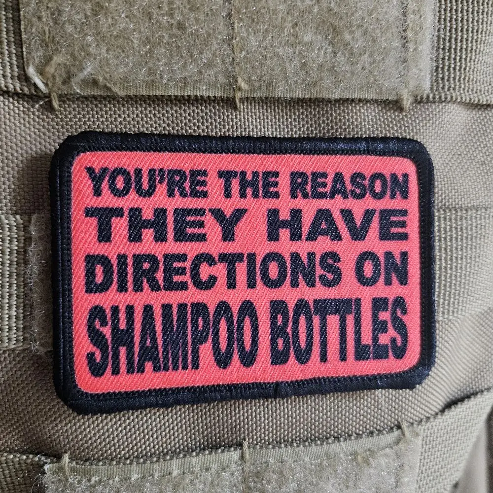 you'rethe reason they have directions on shampoo bottles joke meme removable patch 2"x3" morale patch with hook and loop backing