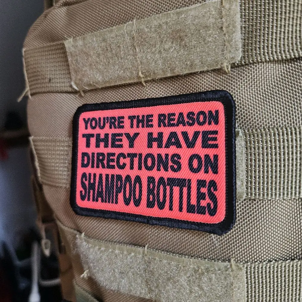 This morale patch measures 2"x3" and features a humorous design. The text reads, "you're the reason they have directions on shampoo bottles joke meme." Perfect for adding a touch of humor to your day. The design is both eye-catching and fun, making it a great accessory for anyone looking to bring a smile.