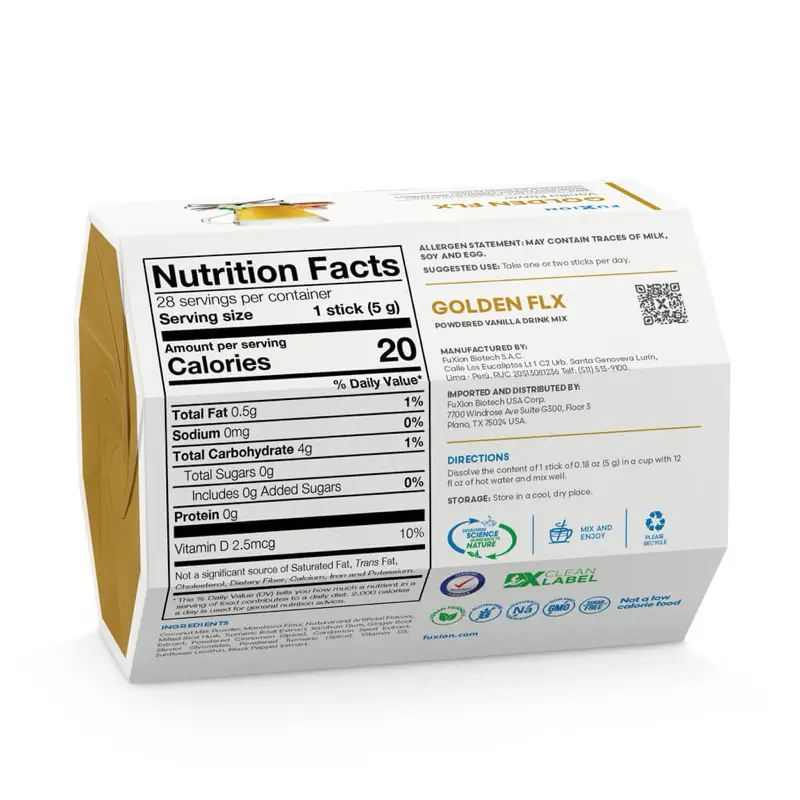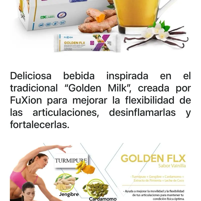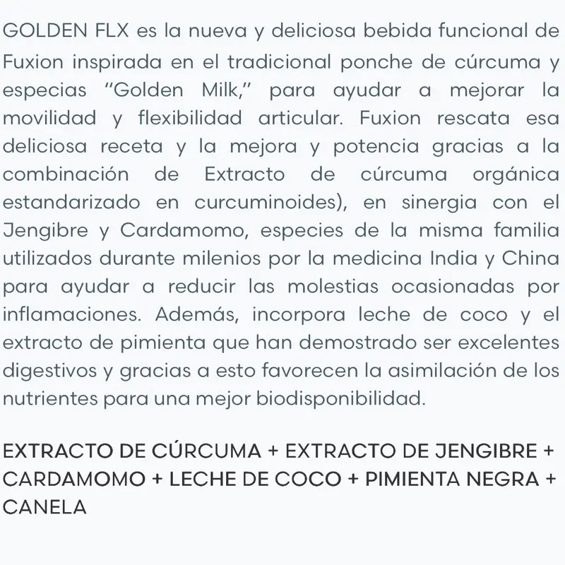 Delicioso té de especias con leche de coco, hecho a base de extracto de cúrcuma orgánica certificada de efecto antioxidante y protector. Los curcuminoides extraídos de la cúrcuma trabajan en sinergia con el jengibre, el cardamomo y la pimienta negra para mantener la flexibilidad de las articulaciones. Los ingredientes de Golden FLX