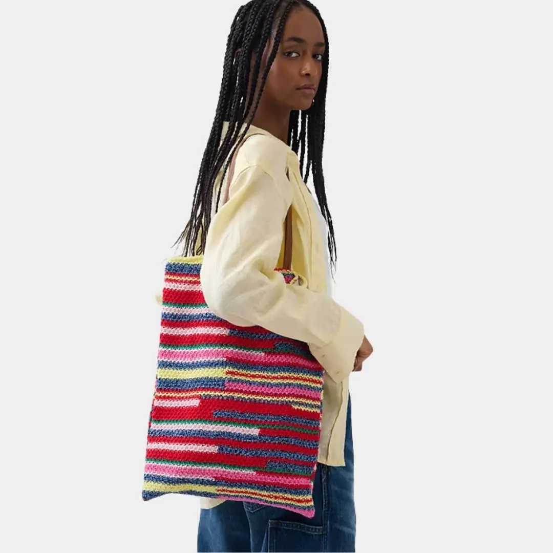 This tote bag features a crochet knit cotton outer, offering a unique texture. Vegan leather shoulder straps add a modern touch. It includes a snap button closure for secure storage. An inner patch pocket provides extra space. Certain styles boast allover stripes for a stylish look. Dimensions are 12" L × 16” H, perfect for everyday use.
