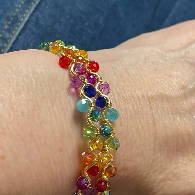 PRIDE Rainbow on Gold Copper Core Wire Wrap Dainty Wave Bangle Bracelet Handmade Adjustable Unique Design with Pink Pearl Hook Closure