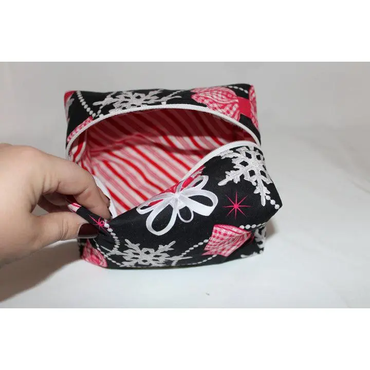 Bring a touch of holiday sparkle wherever you go with the Winter Wishes Bag. Handmade with care, this festive pouch features a charming pattern of red ornaments, silver snowflakes, and twinkling stars. This bag features a white zipper.