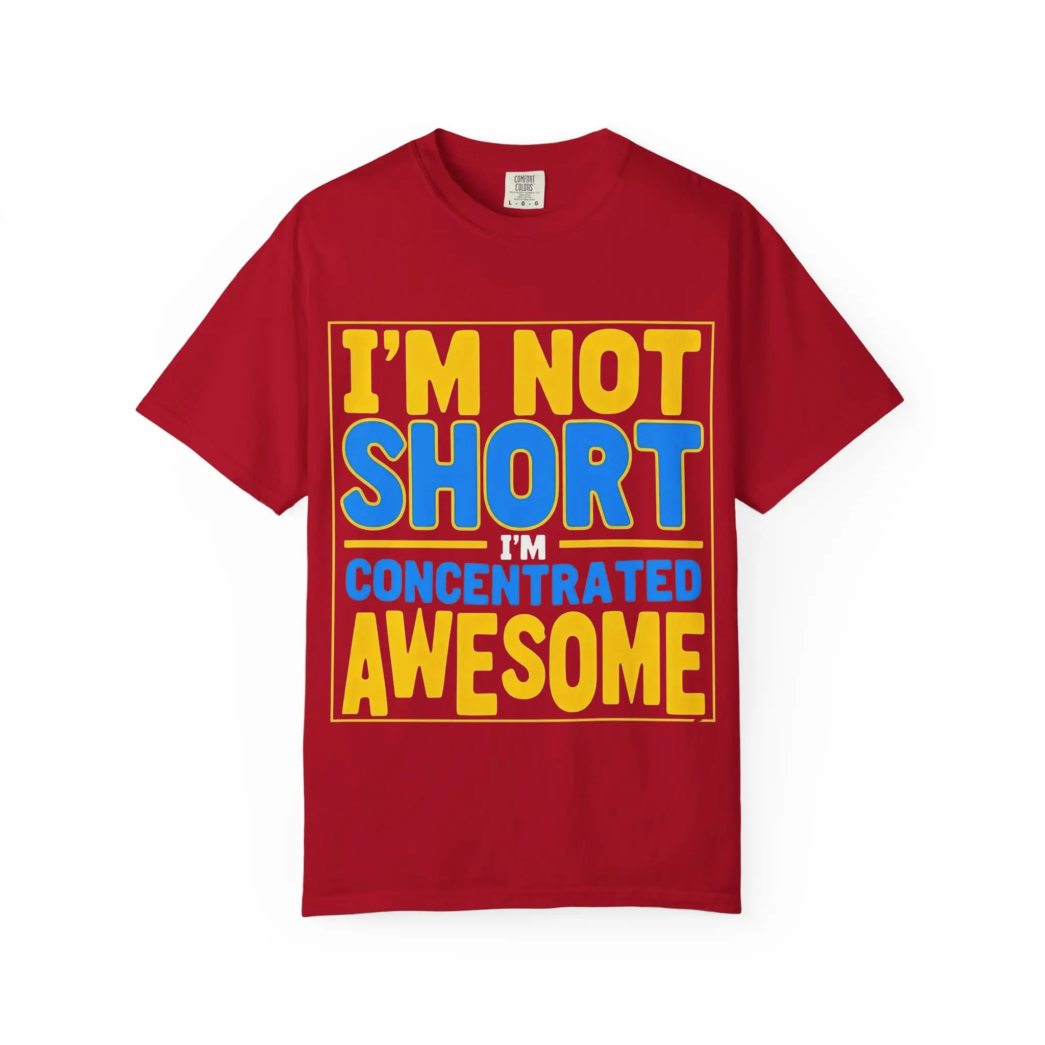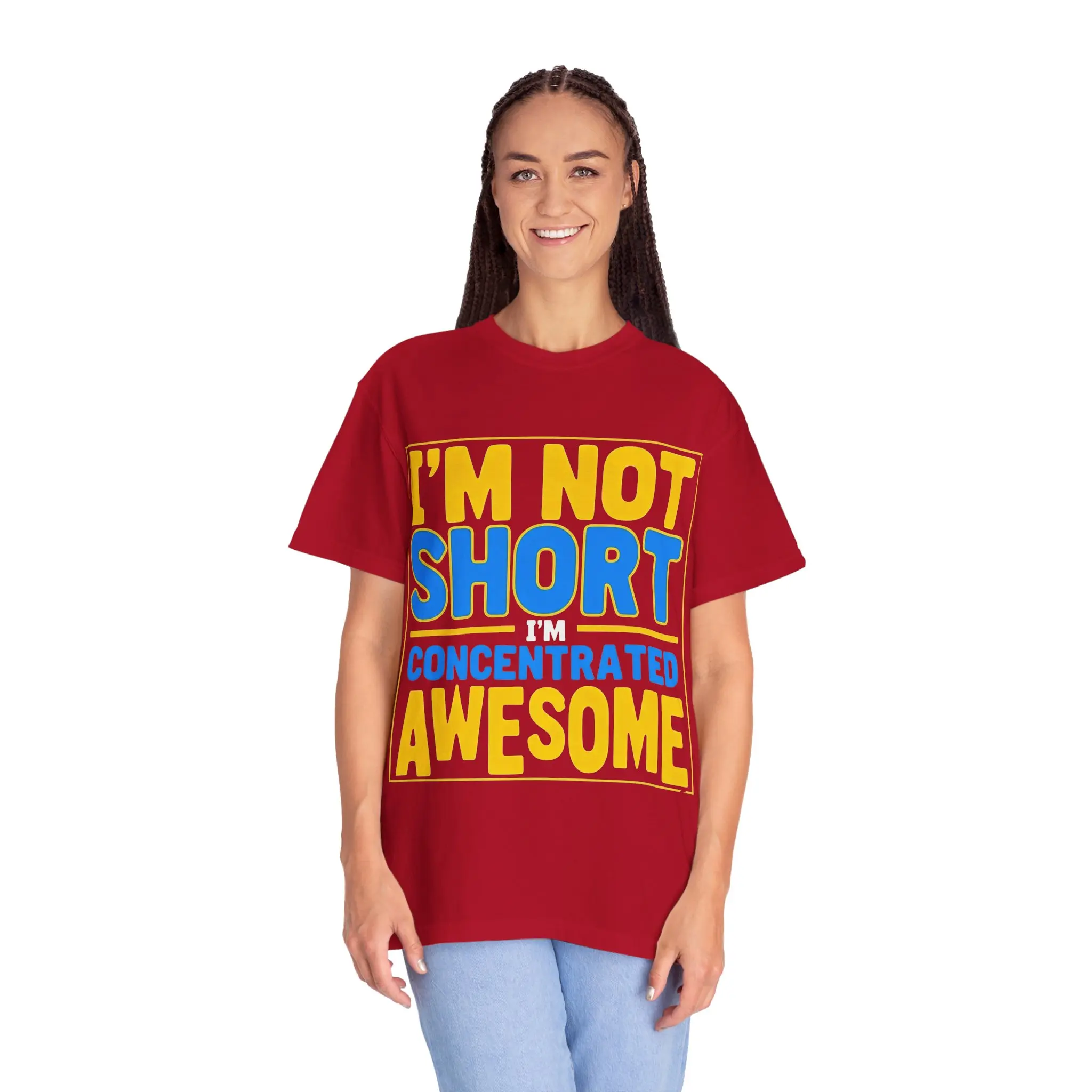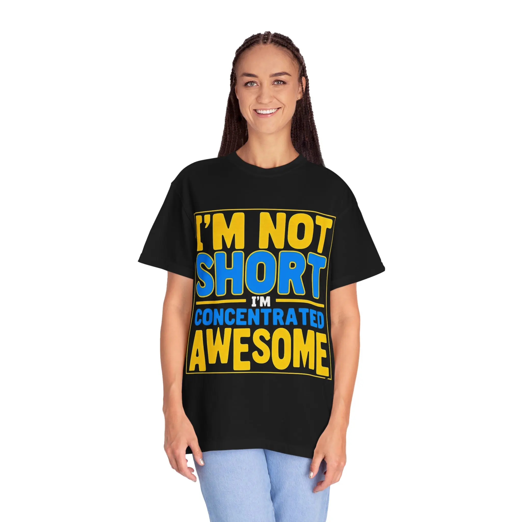 This heavyweight garment-dyed tee carries a bold, playful statement—large retro type in bright yellow and blue that reads “I’m Not Short I’m Concentrated Awesome.” It feels lived-in from the first wear thanks to the post-dye, soft finish and thick 6.1 oz cotton. The relaxed fit and sturdily sewn edges give this shirt an easygoing, confident vibe that reads as both funny and unapologetic. Wear it to poke fun at yourself, break the ice, or add personality to a casual day. The tubular knit (no side seams) and sewn-in label keep the silhouette clean, while the broad size range and many color choices make it simple to match your personal look.