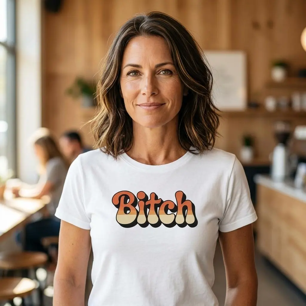 This bold retro tee is made for women who say exactly what they mean and don’t apologize for it. Featuring chunky vintage bubble lettering with a warm 70s-inspired gradient, the design gives off major throwback vibes while making a statement that’s impossible to ignore.