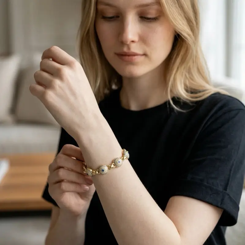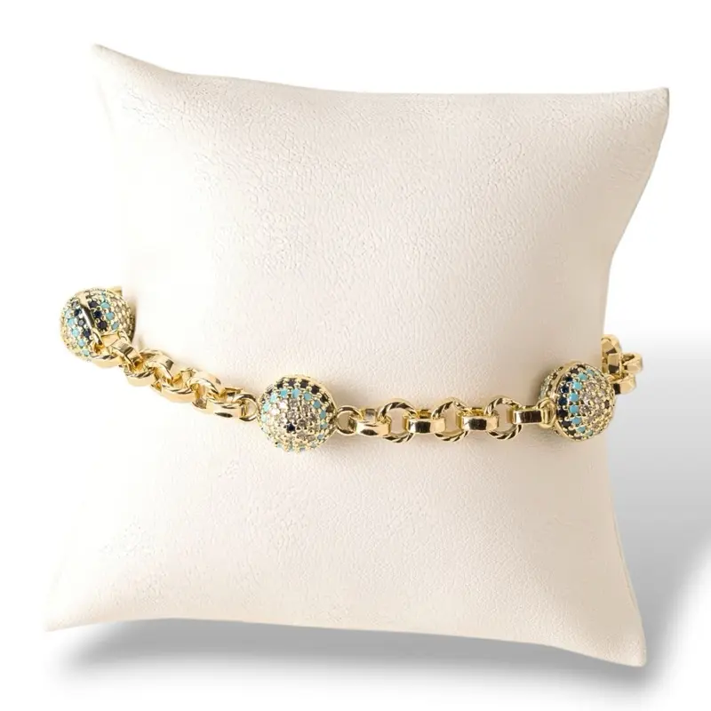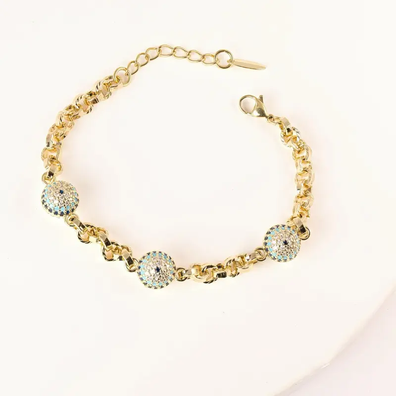 14K Gold Plated Evil Eye Ball Bracelet 7" + 2cm Extension with CZ Blue Stone Jewelry for Women Stylish Adjustable Fit Trendy Elegant Everyday Wear