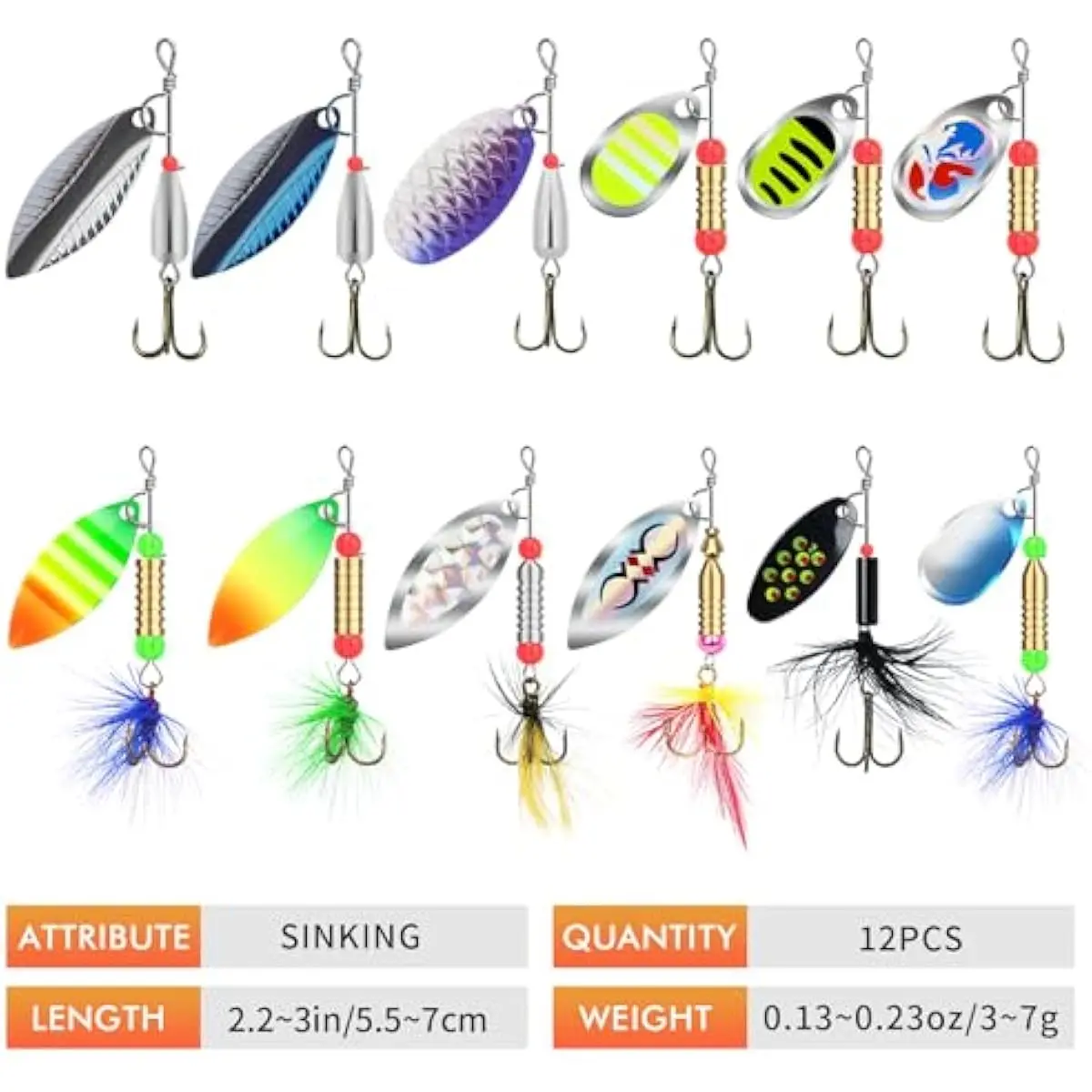 SPINNER FISHING LURES SET: This 12pcs spinner baits contains 2 different sizes of fishing lures 2.2''- 3''. Heavy weighted body: 0.13 - 0.23oz designed for catching more large fish. Ambitious anglers can choose the most suitable lure according to different sizes of fish species and different waters