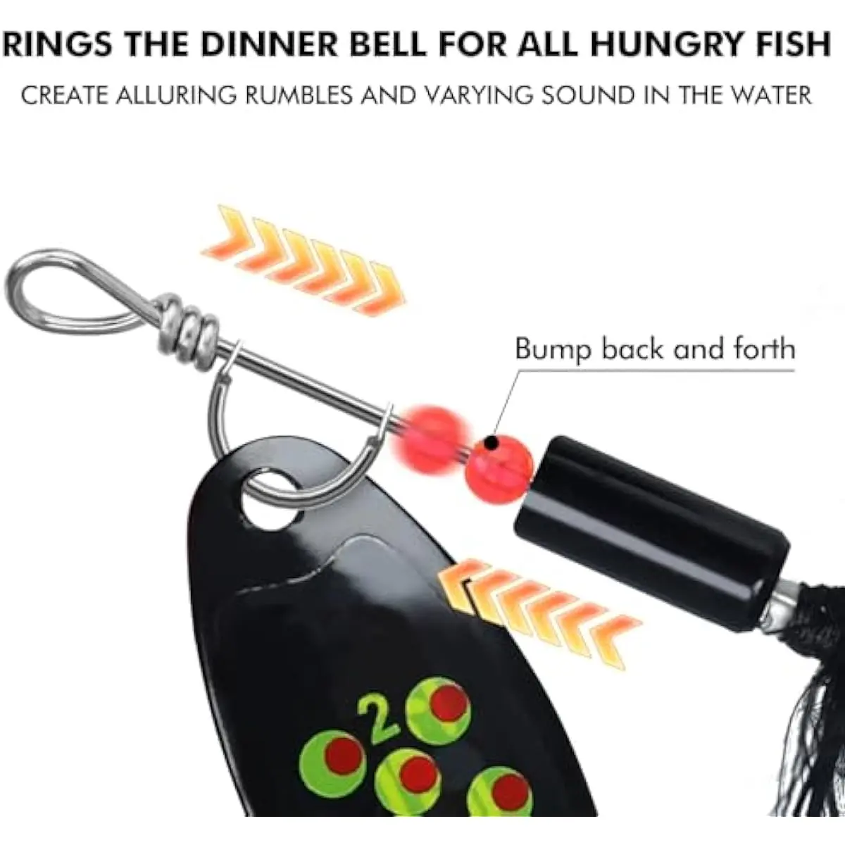 The premium spinner lure kit comes with assorted bright colors and sizes. Life-like swimming actions are Irresistable to big fish.