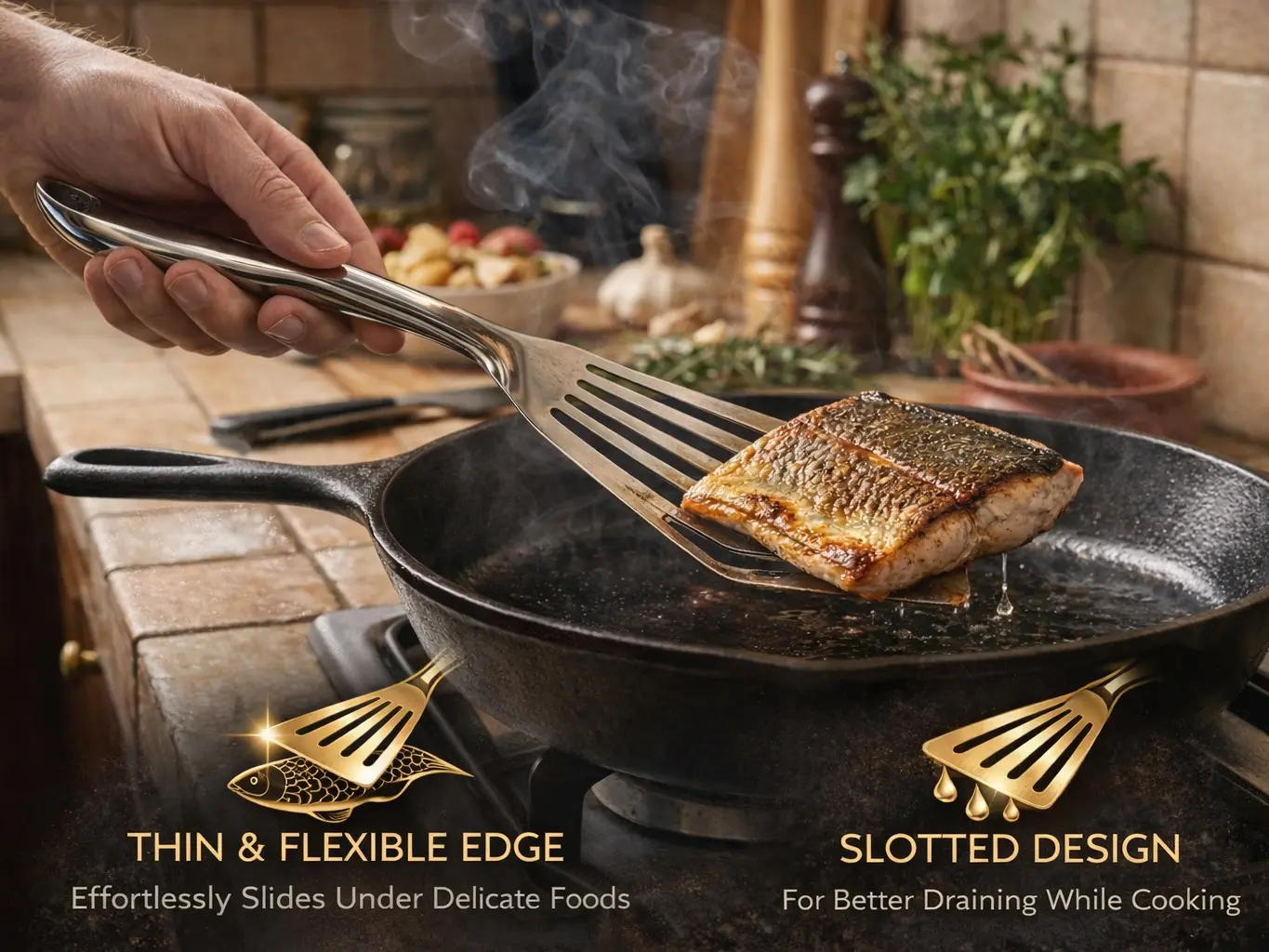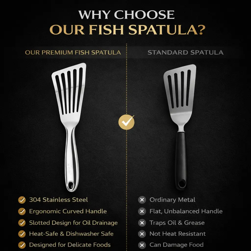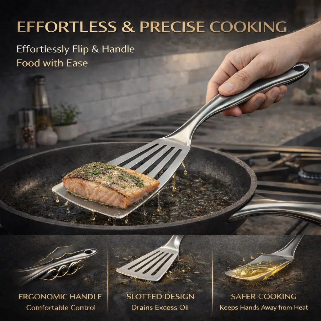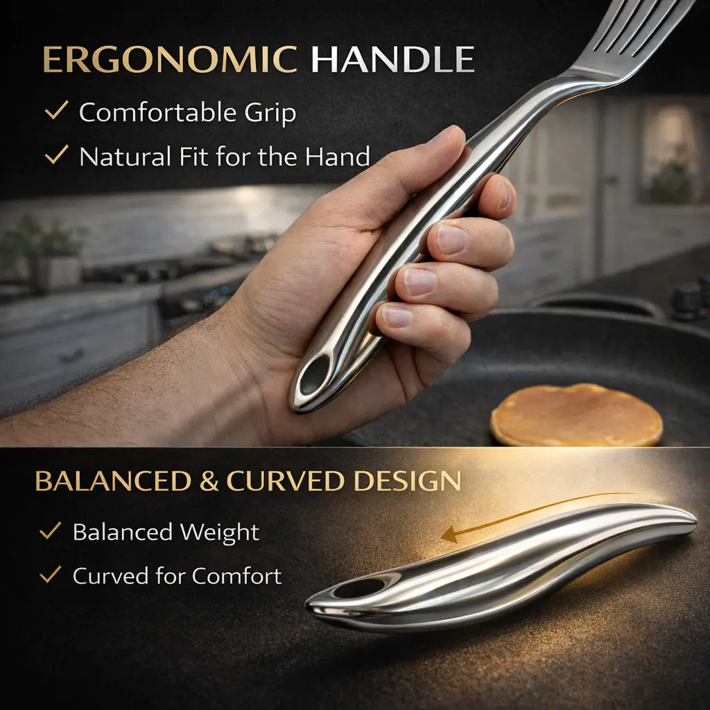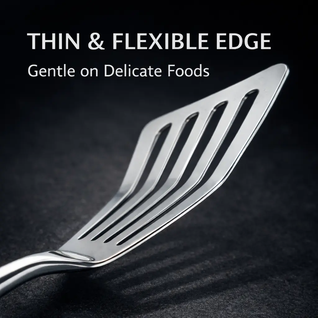 ·Thin & Flexible Edge for Delicate Foods Ultra-thin beveled edge slides smoothly under fish fillets, eggs, and pancakes without breaking or sticking — perfect for delicate cooking tasks.