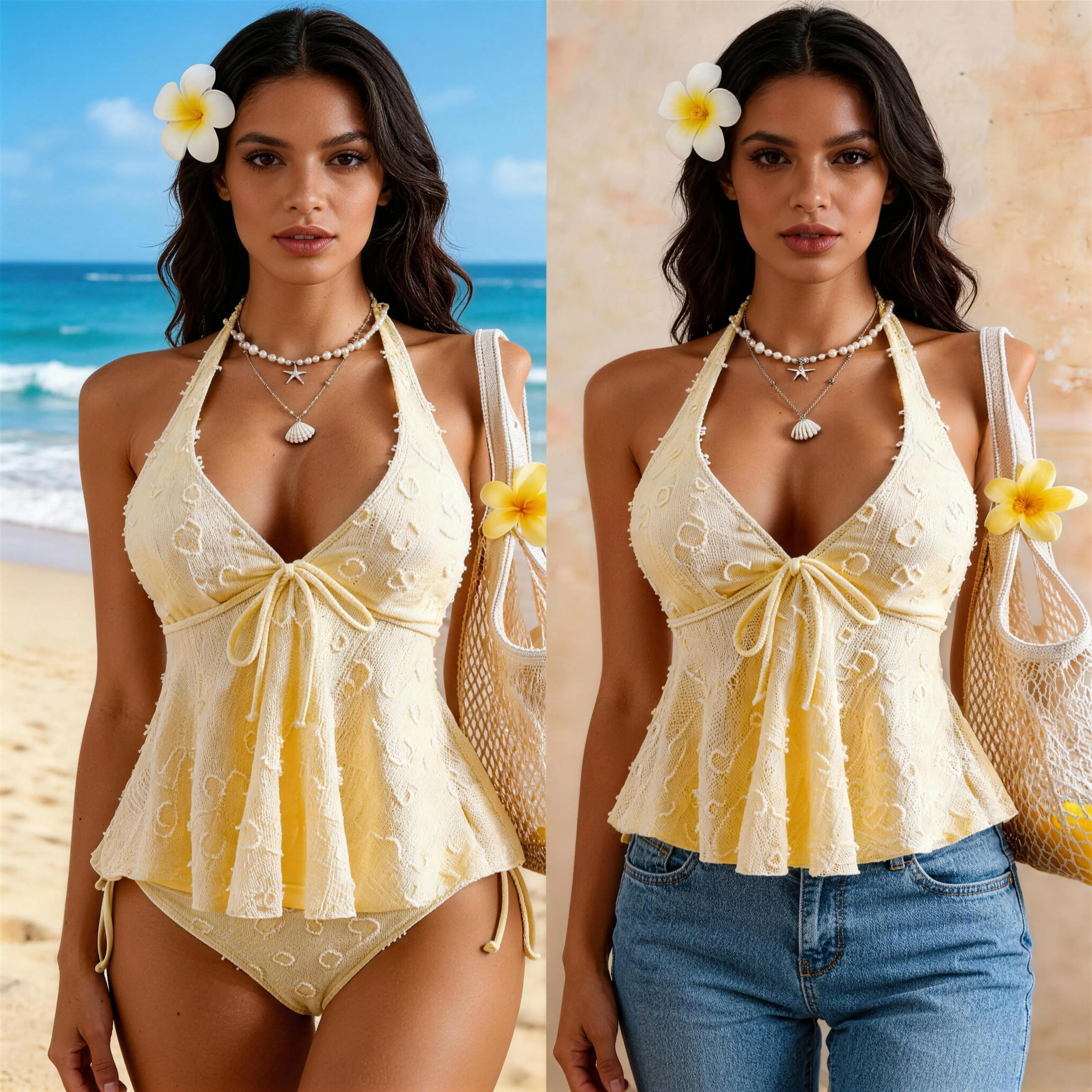 Women's Two-Piece Tank Swimsuit - Bohemian Crochet Lace Halter Top with Bikini Bottom - Multi-functional Swimsuit - Summer Beachwear and Casual Tank Top
