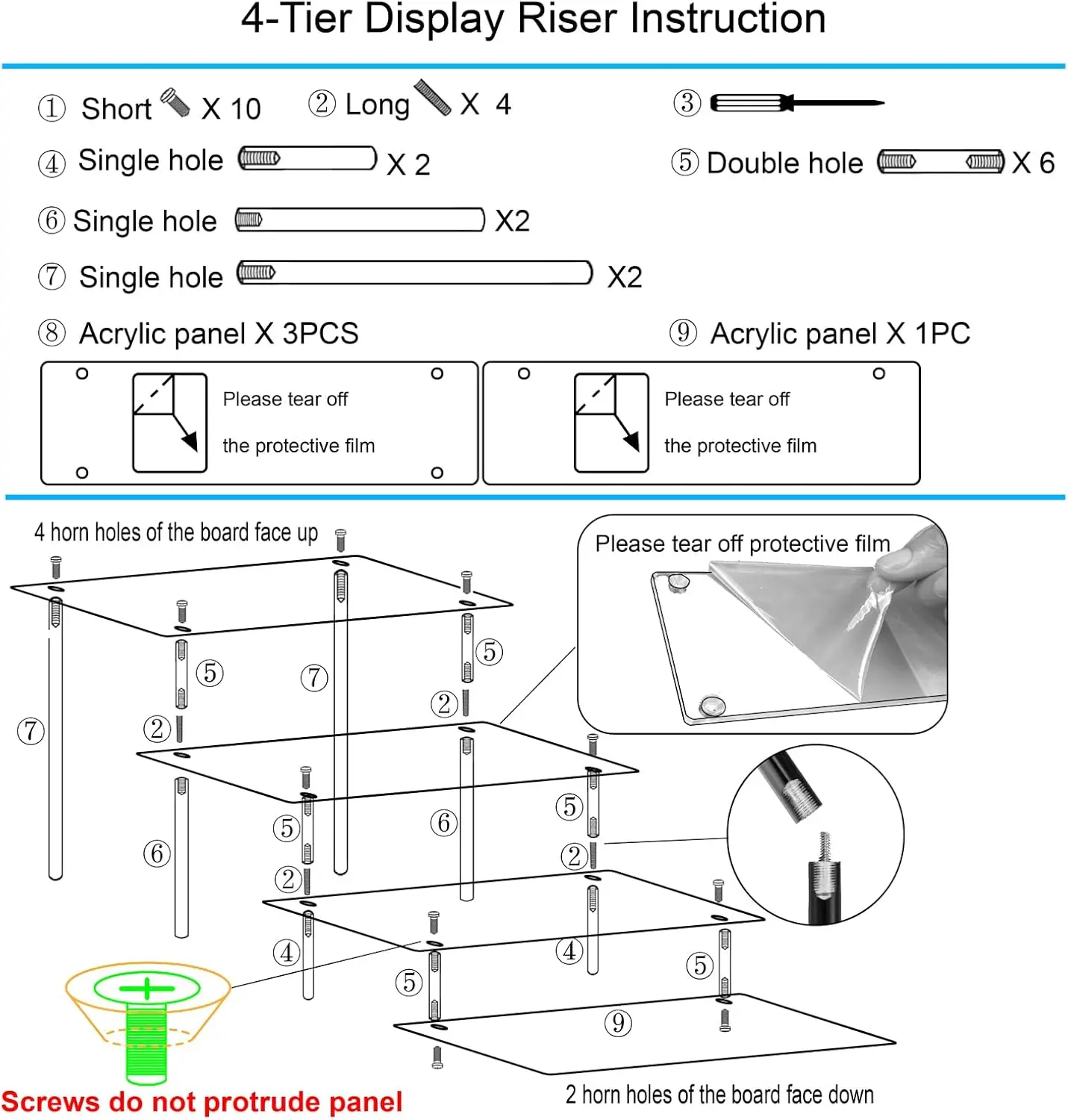 ·What You Get: 4 tier acrylic stand riser include 1 X 4-tier display stand, 1 X Phillips Screwdriver, 1 X Specification