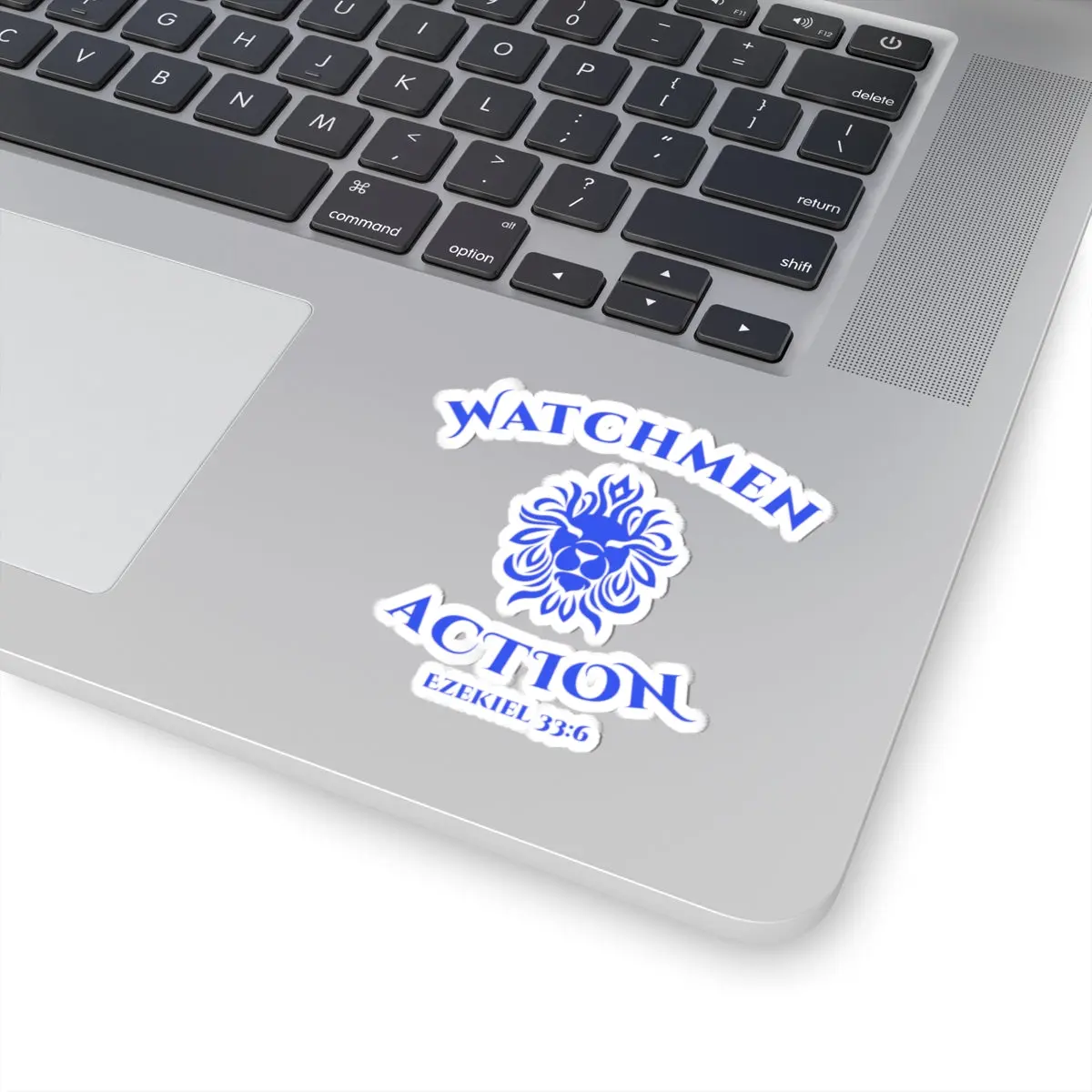 A bold, glossy kiss-cut sticker that carries a clear, faith-forward message. The design centers on a stylized lion emblem with flowing mane details, framed by arched text reading “WATCHMEN” above and “ACTION” below, plus a small scripture reference (Ezekiel 33:6). Printed in vivid blue on durable vinyl with a glossy finish, this sticker brings visual pop to laptops, journals, water bottles (indoor use), and other smooth flat surfaces.