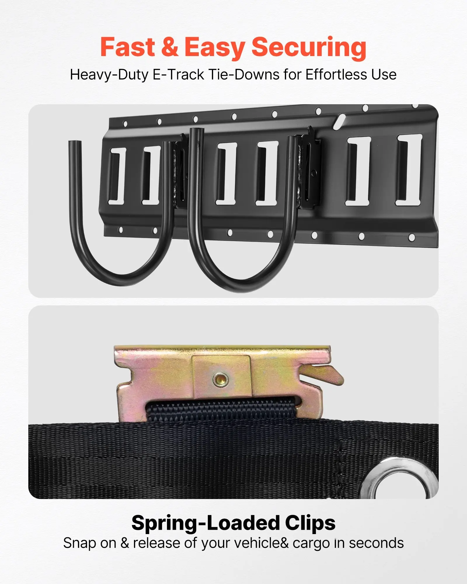 ·Easy Setup for New Users: Spring-loaded clips and click-in hardware install in seconds. The ratchet straps of our E-track rail system let you dial in tension fast, so you secure cargo without tools